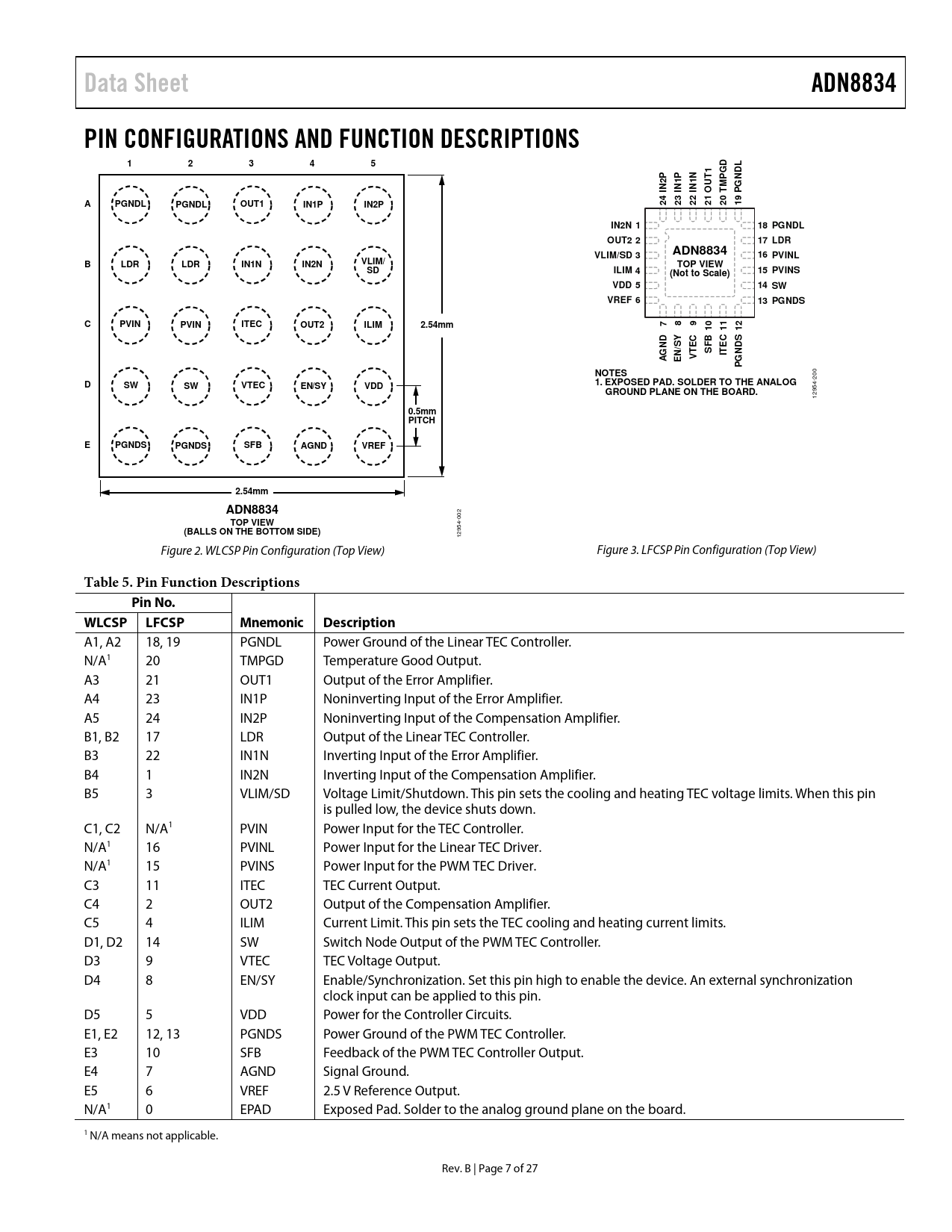 Data SheetADN8834PIN CONFIGURATIONS AND FUNCTION DESCRIPTIONS12345DT1NDLMPGGN2PN1PN1NIIIOUTPAPGNDLPGNDLOUT1IN1PIN2P242322212019IN2N 118 PGNDLOUT2 217 LDRADN8834VLIM/SD 316 PVINLBVLIM/LDRLDRIN1NIN2NTOP VIEWSDILIM 415 PVINS(Not to Scale)VDD 514 SWVREF 613 PGNDSCPVINPVINITECOUT2ILIM2.54mm789101112BCNDSY/ECSFITENDSAGENVTG PNOTES 200 DSWSWVTECEN/SYVDD1. EXPOSED PAD. SOLDER TO THE ANALOGGROUND PLANE ON THE BOARD. 12954- 0.5mm PITCHEPGNDSPGNDSSFBAGNDVREF2.54mmADN8834 002 TOP VIEW(BALLS ON THE BOTTOM SIDE) 12954- Figure 2. WLCSP Pin Configuration (Top View) Figure 3. LFCSP Pin Configuration (Top View) Table 5. Pin Function DescriptionsPin No.WLCSP LFCSPMnemonicDescription A1, A2 18, 19 PGNDL Power Ground of the Linear TEC Controller. N/A1 20 TMPGD Temperature Good Output. A3 21 OUT1 Output of the Error Amplifier. A4 23 IN1P Noninverting Input of the Error Amplifier. A5 24 IN2P Noninverting Input of the Compensation Amplifier. B1, B2 17 LDR Output of the Linear TEC Controller. B3 22 IN1N Inverting Input of the Error Amplifier. B4 1 IN2N Inverting Input of the Compensation Amplifier. B5 3 VLIM/SD Voltage Limit/Shutdown. This pin sets the cooling and heating TEC voltage limits. When this pin is pulled low, the device shuts down. C1, C2 N/A1 PVIN Power Input for the TEC Controller. N/A1 16 PVINL Power Input for the Linear TEC Driver. N/A1 15 PVINS Power Input for the PWM TEC Driver. C3 11 ITEC TEC Current Output. C4 2 OUT2 Output of the Compensation Amplifier. C5 4 ILIM Current Limit. This pin sets the TEC cooling and heating current limits. D1, D2 14 SW Switch Node Output of the PWM TEC Controller. D3 9 VTEC TEC Voltage Output. D4 8 EN/SY Enable/Synchronization. Set this pin high to enable the device. An external synchronization clock input can be applied to this pin. D5 5 VDD Power for the Controller Circuits. E1, E2 12, 13 PGNDS Power Ground of the PWM TEC Controller. E3 10 SFB Feedback of the PWM TEC Controller Output. E4 7 AGND Signal Ground. E5 6 VREF 2.5 V Reference Output. N/A1 0 EPAD Exposed Pad. Solder to the analog ground plane on the board. 1 N/A means not applicable. Rev. B | Page 7 of 27 Document Outline Features Applications Functional Block Diagram General Description Revision History Specifications Absolute Maximum Ratings Thermal Resistance ESD Caution Pin Configurations and Function Descriptions Typical Performance Characteristics Detailed Functional Block Diagram Theory of Operation Analog PID Control Digital PID Control Powering the Controller Enable and Shutdown Oscillator Clock Frequency External Clock Operation Connecting Multiple ADN8834 Devices Temperature Lock Indicator (LFCSP Only) Soft Start on Power-Up TEC Voltage/Current Monitor Voltage Monitor Current Monitor Maximum TEC Voltage Limit Using a Resistor Divider to Set the TEC Voltage Limit Maximum TEC Current Limit Using a Resistor Divider to Set the TEC Current Limit Applications Information Signal Flow Thermistor Setup Thermistor Amplifier (Chopper 1) PID Compensation Amplifier (Chopper 2) MOSFET Driver Amplifiers PWM Output Filter Requirements Inductor Selection Capacitor Selection Input Capacitor Selection Power Dissipation PWM Regulator Power Dissipation Conduction Loss (PCOND) Switching Loss (PSW) Transition Loss (PTRAN) Linear Regulator Power Dissipation PCB Layout Guidelines Block Diagrams and Signal Flow Guidelines for Reducing Noise and Minimizing Power Loss General PCB Layout Guidelines PWM Power Stage Layout Guidelines Linear Power Stage Layout Guidelines Placing the Thermistor Amplifier and PID Components Example PCB Layout Using Two Layers Outline Dimensions Ordering Guide