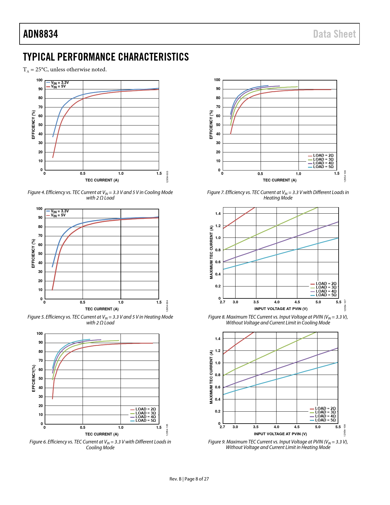 12954- 12954- Figure 4. Efficiency vs. TEC Current at VIN = 3.3 V and 5 V in Cooling Mode Figure 7. Efficiency vs. TEC Current at VIN = 3.3 V with Different Loads in with 2 Ω Load Heating Mode