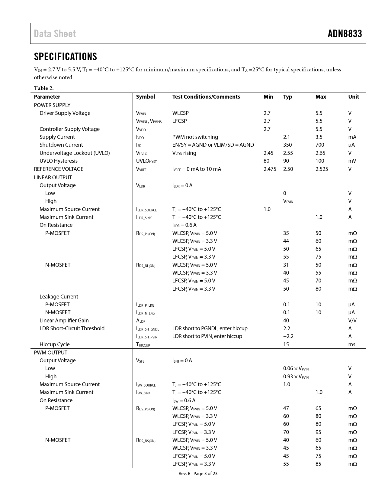 Data Sheet. ADN8833. SPECIFICATIONS. Table 2. Parameter. Symbol. Test Conditions/Comments. Min. Typ. Max. Unit