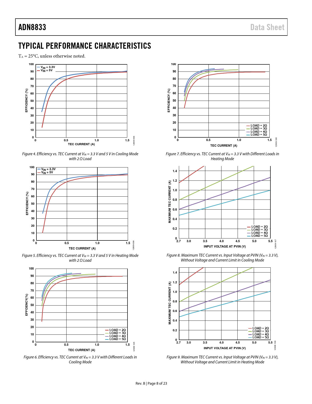 ADN8833Data SheetTYPICAL PERFORMANCE CHARACTERISTICS TA = 25°C, unless otherwise noted. 100100VIN = 3.3V90VIN = 5V9080807070%)%)(60(60YYCCN50N50IEIE40FFIC40FFICEE30302020LOAD = 2ΩLOAD = 3Ω1010LOAD = 4ΩLOAD = 5Ω00 003 00.51.01.500.51.01.5 106 TEC CURRENT (A) 12909- TEC CURRENT (A) 12909- Figure 4. Efficiency vs. TEC Current at VIN = 3.3 V and 5 V in Cooling Mode Figure 7. Efficiency vs. TEC Current at VIN = 3.3 V with Different Loads in with 2 Ω Load Heating Mode 100VIN = 3.3VV1.490IN = 5V801.2A) (70NT 1.0%) (60Y C0.8N50C CURREIEE T 0.640FFICUMEIM30AX 0.4M20LOAD = 2Ω0.2LOAD = 3Ω10LOAD = 4ΩLOAD = 5Ω002.73.03.54.04.55.05.500.51.01.5 107 004 INPUT VOLTAGE AT PVIN (V)TEC CURRENT (A) 12909- 12909- Figure 5. Efficiency vs. TEC Current at VIN = 3.3 V and 5 V in Heating Mode Figure 8. Maximum TEC Current vs. Input Voltage at PVIN (VIN = 3.3 V), with 2 Ω Load Without Voltage and Current Limit in Cooling Mode 1001.490801.2A) (70NT 1.0(%)600.8NCYC CURRE50EECITF0.6F40UMEIM30AX 0.4M20LOAD = 2ΩLOAD = 2Ω0.2LOAD = 3ΩLOAD = 3Ω10LOAD = 4ΩLOAD = 4ΩLOAD = 5ΩLOAD = 5Ω002.73.03.54.04.55.05.5 108 105 00.51.01.5INPUT VOLTAGE AT PVIN (V)TEC CURRENT (A) 12909- 12909- Figure 6. Efficiency vs. TEC Current at VIN = 3.3 V with Different Loads in Figure 9. Maximum TEC Current vs. Input Voltage at PVIN (VIN = 3.3 V), Cooling Mode Without Voltage and Current Limit in Heating Mode Rev. B | Page 8 of 23 Document Outline FEATURES APPLICATIONS FUNCTIONAL BLOCK DIAGRAM GENERAL DESCRIPTION TABLE OF CONTENTS REVISION HISTORY SPECIFICATIONS ABSOLUTE MAXIMUM RATINGS THERMAL RESISTANCE ESD CAUTION PIN CONFIGURATIONS AND FUNCTION DESCRIPTIONS TYPICAL PERFORMANCE CHARACTERISTICS DETAILED FUNCTIONAL BLOCK DIAGRAM THEORY OF OPERATION DIGITAL PID CONTROL POWERING THE DRIVER ENABLE AND SHUTDOWN OSCILLATOR CLOCK FREQUENCY External Clock Operation Connecting Multiple ADN8833 Devices SOFT START ON POWER-UP TEC VOLTAGE/CURRENT MONITOR Voltage Monitor Current Monitor MAXIMUM TEC VOLTAGE LIMIT Using a Resistor Divider to Set the TEC Voltage Limit MAXIMUM TEC CURRENT LIMIT Using a Resistor Divider to Set the TEC Current Limit APPLICATIONS INFORMATION TYPICAL APPLICATION WITH DIGITAL PID USING A DAC THERMISTOR SETUP MOSFET DRIVER AMPLIFIERS PWM OUTPUT FILTER REQUIREMENTS Inductor Selection Capacitor Selection INPUT CAPACITOR SELECTION POWER DISSIPATION PWM Regulator Power Dissipation Conduction Loss (PCOND) Switching Loss (PSW) Transition Loss (PTRAN) Linear Regulator Power Dissipation PCB LAYOUT GUIDELINES BLOCK DIAGRAMS AND SIGNAL FLOW GUIDELINES FOR REDUCING NOISE AND MINIMIZING POWER LOSS General PCB Layout Guidelines PWM Power Stage Layout Guidelines Linear Power Stage Layout Guidelines EXAMPLE PCB LAYOUT USING TWO LAYERS OUTLINE DIMENSIONS ORDERING GUIDE