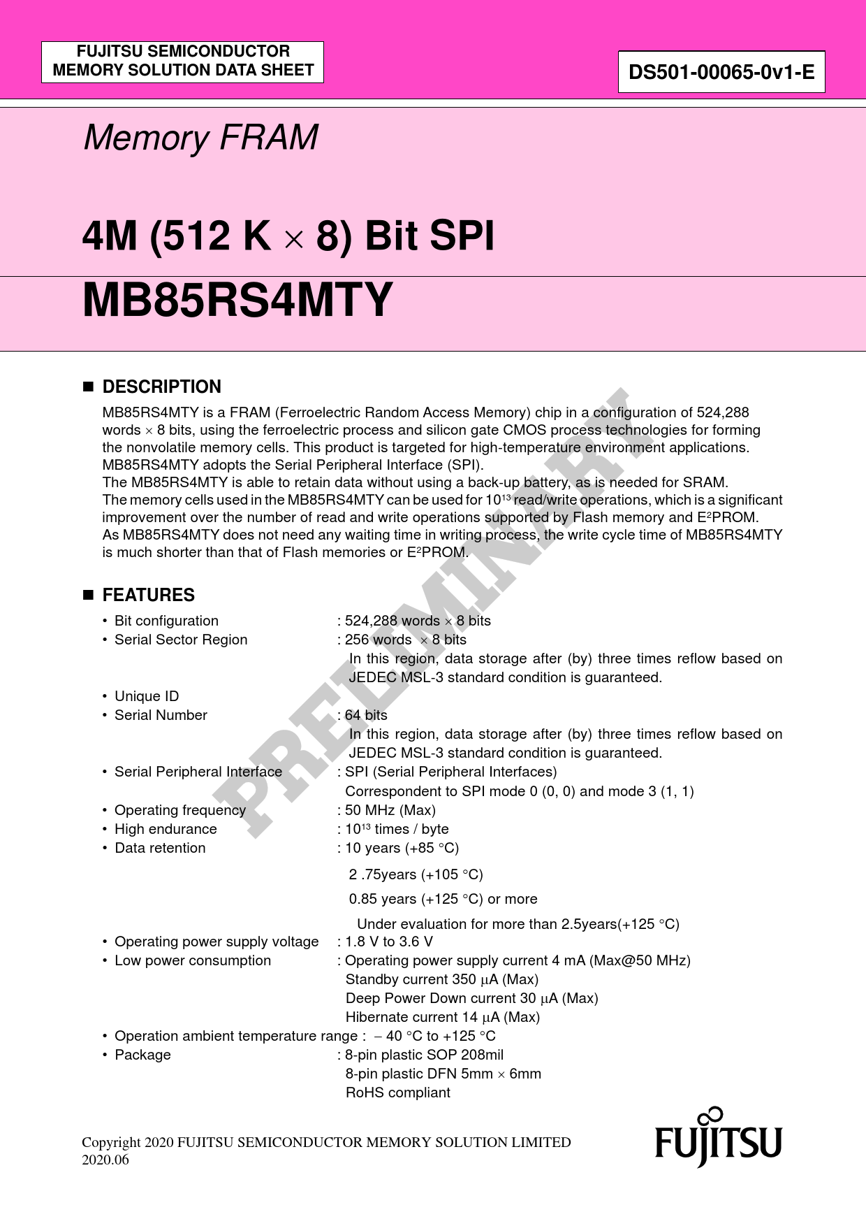 FUJITSU SEMICONDUCTOR. MEMORY SOLUTION DATA SHEET. DS501-00065-0v1-E. 4M (512 K. 8) Bit SPI. MB85RS4MTY. DESCRIPTION. FEATURES