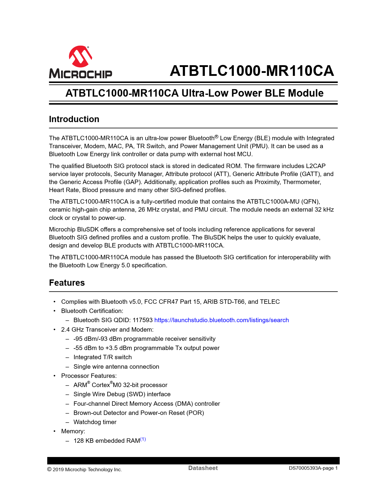 • Complies with Bluetooth v5.0, FCC CFR47 Part 15, ARIB STD-T66, and TELEC • Bluetooth Certification: – Bluetooth SIG QDID: 117593 https://launchstudio.bluetooth.com/listings/search • 2.4 GHz Transceiver and Modem: – -95 dBm/-93 dBm programmable receiver sensitivity – -55 dBm to +3.5 dBm programmable Tx output power – Integrated T/R switch – Single wire antenna connection • Processor Features: – ARM® Cortex®M0 32-bit processor – Single Wire Debug (SWD) interface – Four-channel Direct Memory Access (DMA) controller – Brown-out Detector and Power-on Reset (POR) – Watchdog timer • Memory: – 128 KB embedded RAM(1) © 2019 Microchip Technology Inc.