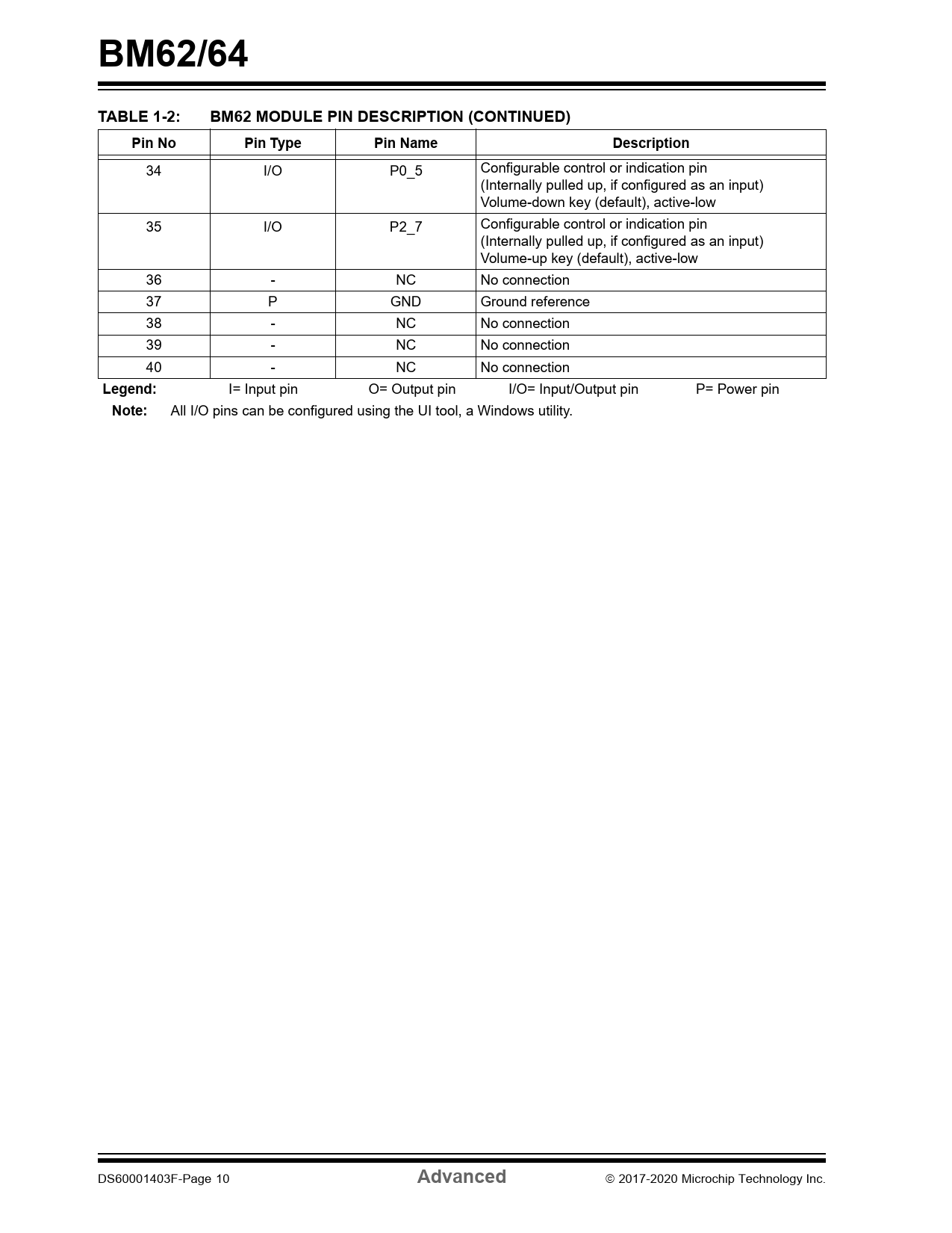 BM62/64. TABLE 1-2:. BM62 MODULE PIN DESCRIPTION (CONTINUED). Pin No. Pin Type. Pin Name. Description. Legend:. Note:. Advanced