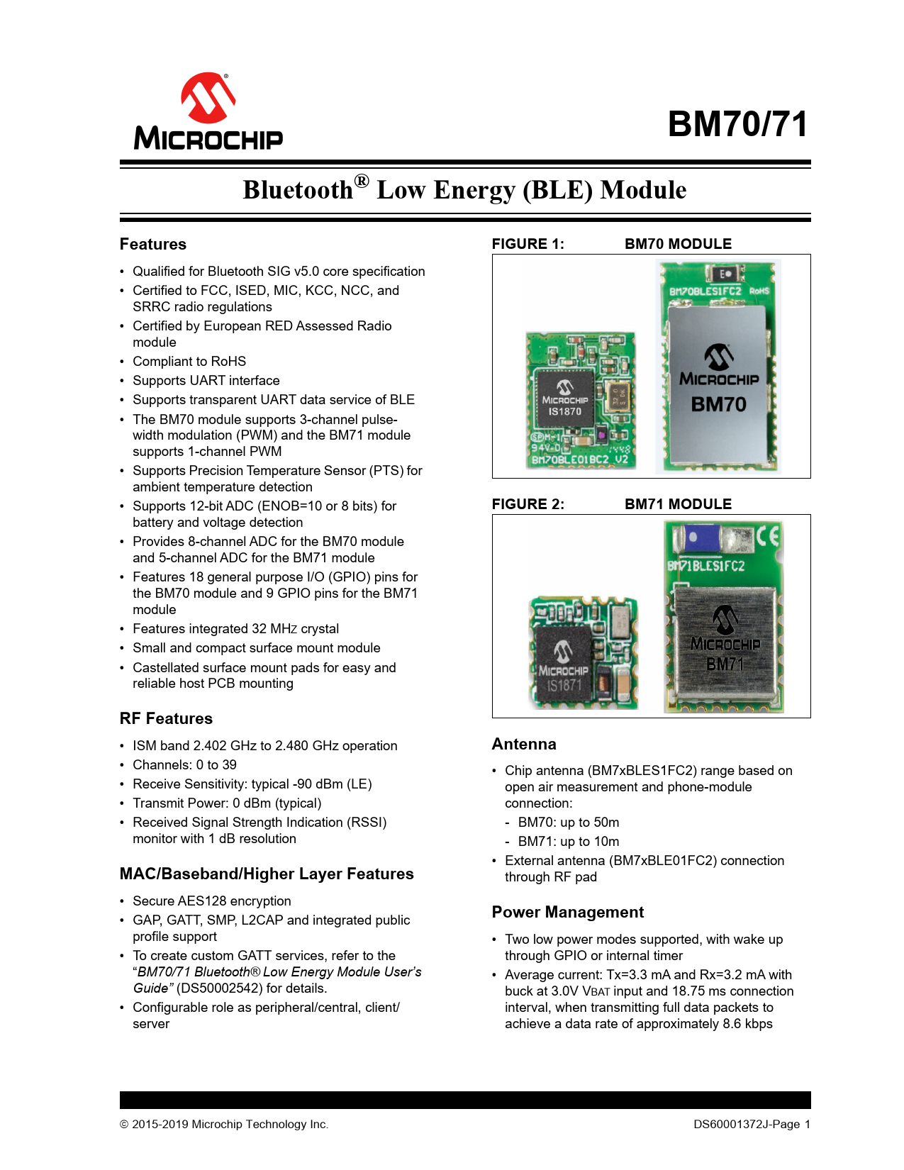 BM70/71Bluetooth® Low Energy (BLE) ModuleFeaturesFIGURE 1:BM70 MODULE • Qualified for Bluetooth SIG v5.0 core specification • Certified to FCC, ISED, MIC, KCC, NCC, and SRRC radio regulations • Certified by European RED Assessed Radio module • Compliant to RoHS • Supports UART interface • Supports transparent UART data service of BLE • The BM70 module supports 3-channel pulse- width modulation (PWM) and the BM71 module supports 1-channel PWM • Supports Precision Temperature Sensor (PTS) for ambient temperature detection • Supports 12-bit ADC (ENOB=10 or 8 bits) for FIGURE 2:BM71 MODULE battery and voltage detection • Provides 8-channel ADC for the BM70 module and 5-channel ADC for the BM71 module • Features 18 general purpose I/O (GPIO) pins for the BM70 module and 9 GPIO pins for the BM71 module • Features integrated 32 MHZ crystal • Smal and compact surface mount module • Castellated surface mount pads for easy and reliable host PCB mounting RF Features • ISM band 2.402 GHz to 2.480 GHz operation Antenna • Channels: 0 to 39 • Chip antenna (BM7xBLES1FC2) range based on • Receive Sensitivity: typical -90 dBm (LE) open air measurement and phone-module • Transmit Power: 0 dBm (typical) connection: • Received Signal Strength Indication (RSSI) - BM70: up to 50m monitor with 1 dB resolution - BM71: up to 10m • External antenna (BM7xBLE01FC2) connection MAC/Baseband/Higher Layer Features through RF pad • Secure AES128 encryption Power Management • GAP, GATT, SMP, L2CAP and integrated public profile support • Two low power modes supported, with wake up • To create custom GATT services, refer to the through GPIO or internal timer “BM70/71 Bluetooth® Low Energy Module User’s • Average current: Tx=3.3 mA and Rx=3.2 mA with Guide” (DS50002542) for details. buck at 3.0V VBAT input and 18.75 ms connection • Configurable role as peripheral/central, client/ interval, when transmitting full data packets to server achieve a data rate of approximately 8.6 kbps 2015-2019 Microchip Technology Inc. DS60001372J-Page 1 Document Outline Features RF Features MAC/Baseband/Higher Layer Features FIGURE 1: BM70 MODULE FIGURE 2: BM71 MODULE Antenna Power Management Operating Conditions Applications General Description Table of Contents Most Current Data Sheet Errata Customer Notification System 1.0 Device Overview 1.1 Interface Description FIGURE 1-1: BM70 module Block Diagram FIGURE 1-2: BM71 module Block Diagram FIGURE 1-3: BM70BLE01FC2 Pin Diagram FIGURE 1-4: BM70BLES1FC2 Pin Diagram FIGURE 1-5: BM71ble01fc2 Pin Diagram FIGURE 1-6: BM71bles1fc2 Pin Diagram TABLE 1-1: BM70/71 PIN Description TABLE 1-2: BM70/71 module Hardware Features TABLE 1-3: Test Pads Details 2.0 Application Information 2.1 Reference Schematics FIGURE 2-1: BM70BLEs1FC2 Reference circuit FIGURE 2-2: BM70BLEs1FC2 Reference circuit FIGURE 2-3: bm70ble01fc2 reference circuit FIGURE 2-4: bm70ble01fc2 reference circuit FIGURE 2-5: bm71ble01fc2 reference circuit FIGURE 2-6: bm71ble01fc2 reference circuit FIGURE 2-7: bm71bles1fc2 reference circuit FIGURE 2-8: bm71bles1fc2 reference circuit - Optional 2.2 External Configuration and Programming FIGURE 2-9: External Configuration and programming 2.3 Host MCU Interface 2.3.1 Host MCU Interface over UART FIGURE 2-10: bm70 module to MCU interface FIGURE 2-11: bm71 module to MCU interface 2.3.2 UART Ready After External Reset FIGURE 2-12: timing diagram of BM70/71 module UART ready for test mode after reset 2.3.3 UART Ready After Power-on Reset FIGURE 2-13: timing diagram of bm70 module UART ready for test mode after power-on 2.4 Typical Hosted Configuration FIGURE 2-14: bm71 module typical hosted configuration 2.5 Power-Drop Protection FIGURE 2-15: reset circuit block diagram 3.0 Module Configuration 3.1 UART Interface 3.2 Control and Indication I/O Pins TABLE 3-1: Configuration And Indication I/O Assignments For BM70 module TABLE 3-2: Configuration And Indication I/O Assignments For BM71 module 3.3 Reset (RST_N) 3.4 System Configuration TABLE 3-3: System Configuration Settings 4.0 Antenna 4.1 Antenna Characteristics 4.1.1 BM70BLES1FC2 Ceramic Chip Antenna FIGURE 4-1: BM70BLES1FC2 Antenna Radiation Pattern TABLE 4-1: BM70BLES1FC2 Antenna Radiation Pattern details 4.1.2 BM71BLES1FC2 Ceramic Chip Antenna FIGURE 4-2: BM71BLES1FC2 Antenna Radiation Pattern TABLE 4-2: BM71BLES1FC2 Antenna Radiation Pattern details 4.2 Antenna Placement FIGURE 4-3: bm70bles1fc2 Antenna Placement examples FIGURE 4-4: bm71bles1fc2 Antenna Placement examples 4.3 Antenna Considerations TABLE 4-3: BM70BLES1FC2 Antenna details TABLE 4-4: BM71BLES1FC2 Antenna details 4.4 Host PCB Mounting Suggestion 4.4.1 BM70BLES1FC2 Host PCB Mounting FIGURE 4-5: bm70bles1fc2 host PCB mounting suggestion 4.4.2 BM70BLE01FC2 Host PCB Mounting FIGURE 4-6: bm70ble01fc2 host pcb mounting suggestions 4.4.3 BM71BLES1FC2 Host PCB Mounting FIGURE 4-7: BM71BLES1FC2 host mounting suggestion 4.4.4 BM71BLE01FC2 HOST PCB MOUNTING FIGURE 4-8: bm71ble01fc2 host pcb mounting suggestion 5.0 Electrical Characteristics Absolute Maximum Ratings TABLE 5-1: Recommended Operating Conditions TABLE 5-2: RF Specifications 5.1 Current Consumption Details 5.1.1 Tx/Rx current consumption details FIGURE 5-1: Tx/Rx Peak Current Consumption of an Advertising Event FIGURE 5-2: Tx/Rx Average Current Consumption while BM70/71 module is Advertising TABLE 5-3: Bm70/71 application mode current consumption Measurements 6.0 Physical dimensions 6.1 BM70BLES1FC2 FIGURE 6-1: BM70BLES1FC2 Module Dimensions FIGURE 6-2: BM70BLES1FC2 Recommended PCB Footprint 6.2 BM70BLE01FC2 FIGURE 6-3: BM70BLE01FC2 Module Dimensions FIGURE 6-4: BM70BLE01FC2 Recommended PCB Foot print 6.3 BM71BLES1FC2 FIGURE 6-5: BM71BLES1FC2 Module Dimensions FIGURE 6-6: BM71BLES1FC2 Recommended PCB Footprint 6.4 BM71BLE01FC2 FIGURE 6-7: BM71BLE01FC2 Module Dimensions FIGURE 6-8: BM71BLE01FC2 Recommended PCB Footprint 7.0 Soldering Recommendations FIGURE 7-1: Reflow Prof