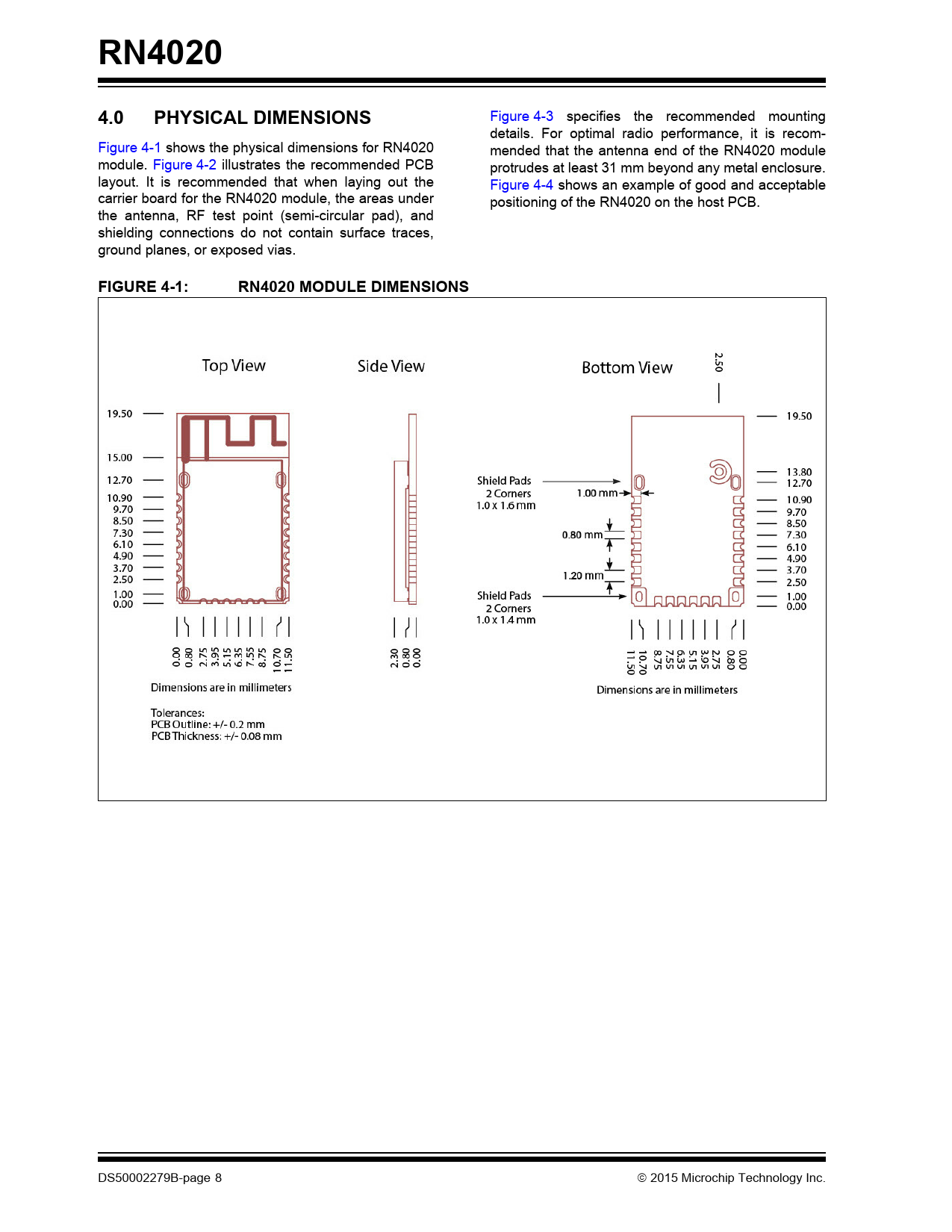 Figure 4-3 specifies the recommended mounting details. For optimal radio performance, it is recom- Figure 4-1 shows the physical dimensions for RN4020 mended that the antenna end of the RN4020 module module. Figure 4-2 illustrates the recommended PCB protrudes at least 31 mm beyond any metal enclosure. layout. It is recommended that when laying out the Figure 4-4 shows an example of good and acceptable carrier board for the RN4020 module, the areas under positioning of the RN4020 on the host PCB. the antenna, RF test point (semi-circular pad), and shielding connections do not contain surface traces, ground planes, or exposed vias.