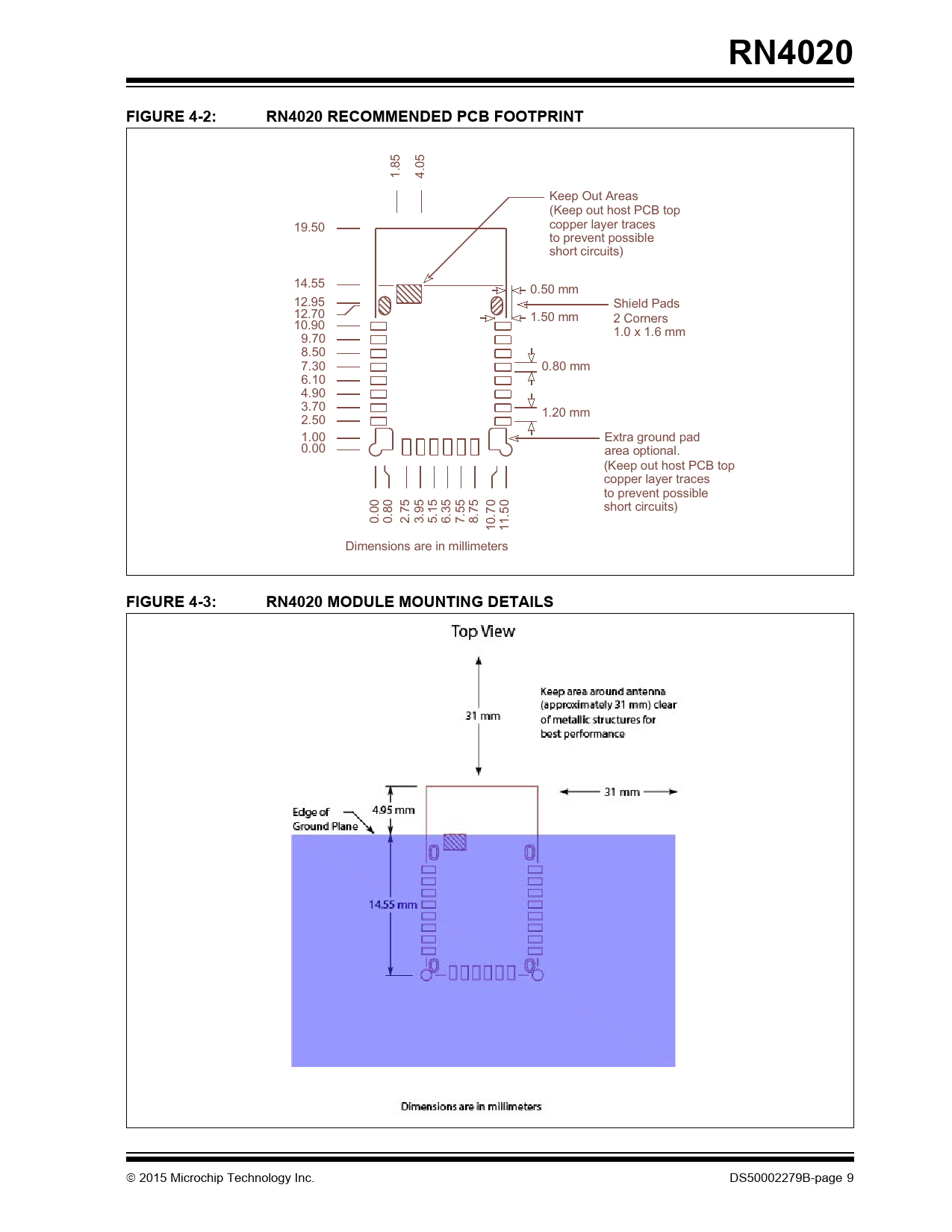 RN4020. FIGURE 4-2:. RN4020 RECOMMENDED PCB FOOTPRINT. FIGURE 4-3:. RN4020 MODULE MOUNTING DETAILS