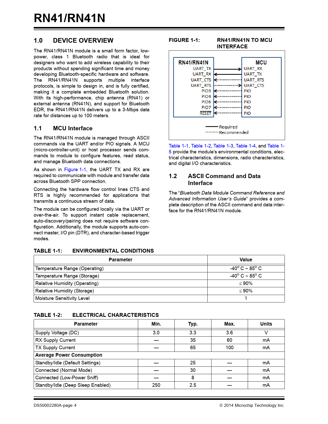 link to page 4 link to page 4 link to page 5 link to page 5 link to page 5 link to page 5 link to page 4 RN41/RN41N1.0DEVICE OVERVIEWFIGURE 1-1:RN41/RN41N TO MCU INTERFACE The RN41/RN41N module is a small form factor, low- power, class 1 Bluetooth radio that is ideal for designers who want to add wireless capability to their products without spending significant time and money developing Bluetooth-specific hardware and software. The RN41/RN41N supports multiple interface protocols, is simple to design in, and is fully certified, making it a complete embedded Bluetooth solution. With its high-performance, chip antenna (RN41) or external antenna (RN41N), and support for Bluetooth EDR, the RN41/RN41N delivers up to a 3-Mbps data rate for distances up to 100 meters. 1.1MCU Interface The RN41/RN41N module is managed through ASCII commands via the UART and/or PIO signals. A MCU Table 1-1, Table 1-2, Table 1-3, Table 1-4, and Table 1- (micro-controller-unit) or host processor sends com- 5 provide the module’s environmental conditions, elec- mands to module to configure features, read status, trical characteristics, dimensions, radio characteristics, and manage Bluetooth data connections. and digital I/O characteristics. As shown in Figure 1-1, the UART TX and RX are required to communicate with module and transfer data 1.2ASCII Command and Data across Bluetooth SPP connection. Interface Connecting the hardware flow control lines CTS and RTS is highly recommended for applications that The “Bluetooth Data Module Command Reference and transmits a continuous stream of data. Advanced Information User’s Guide” provides a com- plete description of the ASCII command and data inter- The module can be configured local y via the UART or face for the RN41/RN41N module. over-the-air. To support instant cable replacement, auto-discovery/pairing does not require software con- figuration. Additionally, the module supports auto-con- nect master, I/O pin (DTR), and character-based trigger modes. TABLE 1-1:ENVIRONMENTAL CONDITIONSParameterValue Temperature Range (Operating) -40o C ~ 85o C Temperature Range (Storage) -40o C ~ 85o C Relative Humidity (Operating) 90% Relative Humidity (Storage) 90% Moisture Sensitivity Level 1 TABLE 1-2:ELECTRICAL CHARACTERISTICSParameterMin.Typ.Max.Units Supply Voltage (DC) 3.0 3.3 3.6 V RX Supply Current — 35 60 mA TX Supply Current — 65 100 mA Average Power Consumption Standby/Idle (Default Settings) — 25 — mA Connected (Normal Mode) — 30 — mA Connected (Low-Power Sniff) — 8 — mA Standby/Idle (Deep Sleep Enabled) 250 2.5 — mA DS50002280A-page 4 2014 Microchip Technology Inc. Document Outline 1.0 Device Overview 1.1 MCU Interface 1.2 ASCII Command and Data Interface TABLE 1-1: Environmental Conditions TABLE 1-2: Electrical Characteristics TABLE 1-3: Module Dimensions TABLE 1-4: Radio Characteristics TABLE 1-5: Digital I/O Characteristics TABLE 1-6: Pin Description 2.0 Application Information 2.1 Reset Circuit 2.2 Factory Reset Using GPIO4 2.3 Connection Status TABLE 2-1: GPIO5 Status TABLE 2-2: GPIO2 Status 2.4 Module Mounting Details 2.5 External Antenna Types (RN41N) TABLE 2-3: Tested External Antenna Types 2.6 HCI Mode 2.7 Soldering Recommendations 2.8 SPI Interface 2.9 Bluetooth SIG QDID 2.10 Application Schematic 3.0 Regulatory Approval 3.1 United States 3.2 Canada 3.3 Europe TABLE 3-1: RN41 European Compliance Testing TABLE 3-2: RN41N European Compliance Testing 3.4 Australia 3.5 New Zealand 4.0 Ordering Information TABLE 4-1: Ordering Information Class 1 Bluetooth® Module with EDR Support Worldwide Sales and Service