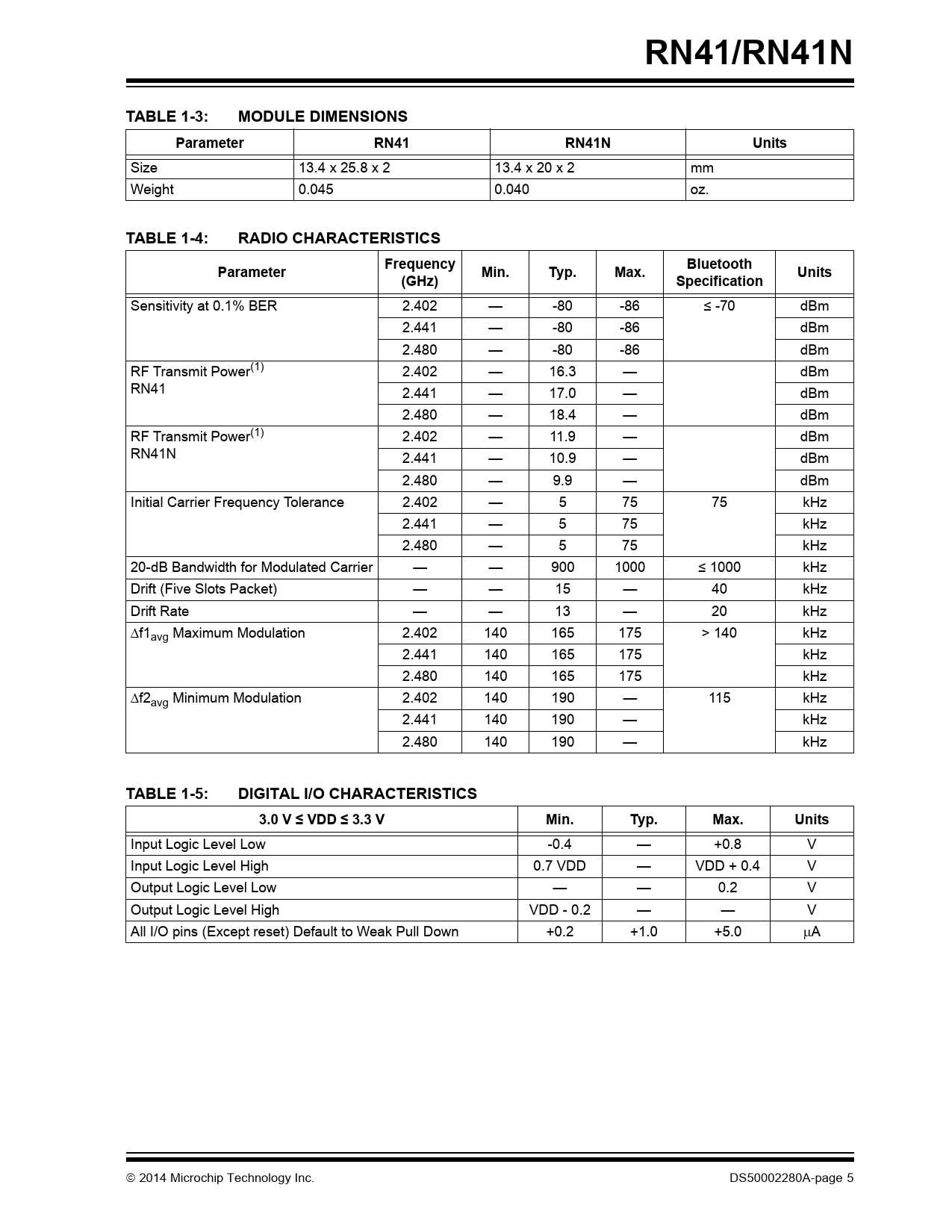 RN41/RN41N. TABLE 1-3:. MODULE DIMENSIONS. Parameter. RN41. RN41N. Units. TABLE 1-4:. RADIO CHARACTERISTICS. Frequency. Bluetooth. Min. Typ. Max