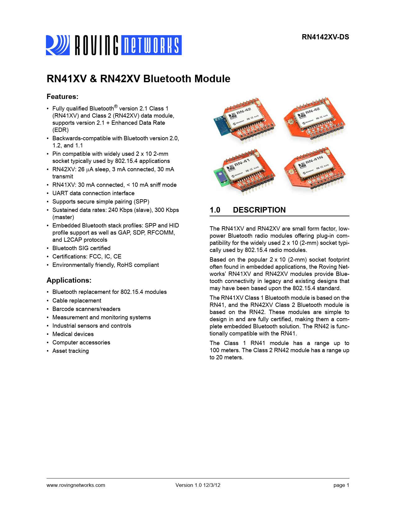 RN4142XV-DSRN41XV & RN42XV Bluetooth ModuleFeatures: • Fully qualified Bluetooth® version 2.1 Class 1 (RN41XV) and Class 2 (RN42XV) data module, supports version 2.1 + Enhanced Data Rate (EDR) • Backwards-compatible with Bluetooth version 2.0, 1.2, and 1.1 • Pin compatible with widely used 2 x 10 2-mm socket typically used by 802.15.4 applications • RN42XV: 26 μA sleep, 3 mA connected, 30 mA transmit • RN41XV: 30 mA connected, < 10 mA sniff mode • UART data connection interface • Supports secure simple pairing (SPP) • Sustained data rates: 240 Kbps (slave), 300 Kbps 1.0DESCRIPTION (master) • Embedded Bluetooth stack profiles: SPP and HID The RN41XV and RN42XV are small form factor, low- profile support as well as GAP, SDP, RFCOMM, power Bluetooth radio modules offering plug-in com- and L2CAP protocols patibility for the widely used 2 x 10 (2-mm) socket typi- • Bluetooth SIG certified cally used by 802.15.4 radio modules. • Certifications: FCC, IC, CE Based on the popular 2 x 10 (2-mm) socket footprint • Environmentally friendly, RoHS compliant often found in embedded applications, the Roving Net- works’ RN41XV and RN42XV modules provide Blue- Applications: tooth connectivity in legacy and existing designs that may have been based upon the 802.15.4 standard. • Bluetooth replacement for 802.15.4 modules • Cable replacement The RN41XV Class 1 Bluetooth module is based on the RN41, and the RN42XV Class 2 Bluetooth module is • Barcode scanners/readers based on the RN42. These modules are simple to • Measurement and monitoring systems design in and are fully certified, making them a com- • Industrial sensors and controls plete embedded Bluetooth solution. The RN42 is func- • Medical devices tionally compatible with the RN41. • Computer accessories The Class 1 RN41 module has a range up to • Asset tracking 100 meters. The Class 2 RN42 module has a range up to 20 meters. www.rovingnetworks.com Version 1.0 12/3/12 page 1 Document Outline Features: Applications: 1.0 Description 2.0 Overview FIGURE 2-1: RN41XV & RN42XV Dimensions 3.0 Typical Application Schematic FIGURE 3-1: Application Schematic, Note 1 4.0 Design Concerns 4.1 Powering the Module 4.2 Reset Circuit 4.3 Factory Reset Using GPIO4 4.4 Connection Status 5.0 Compliance Information 6.0 Ordering Information