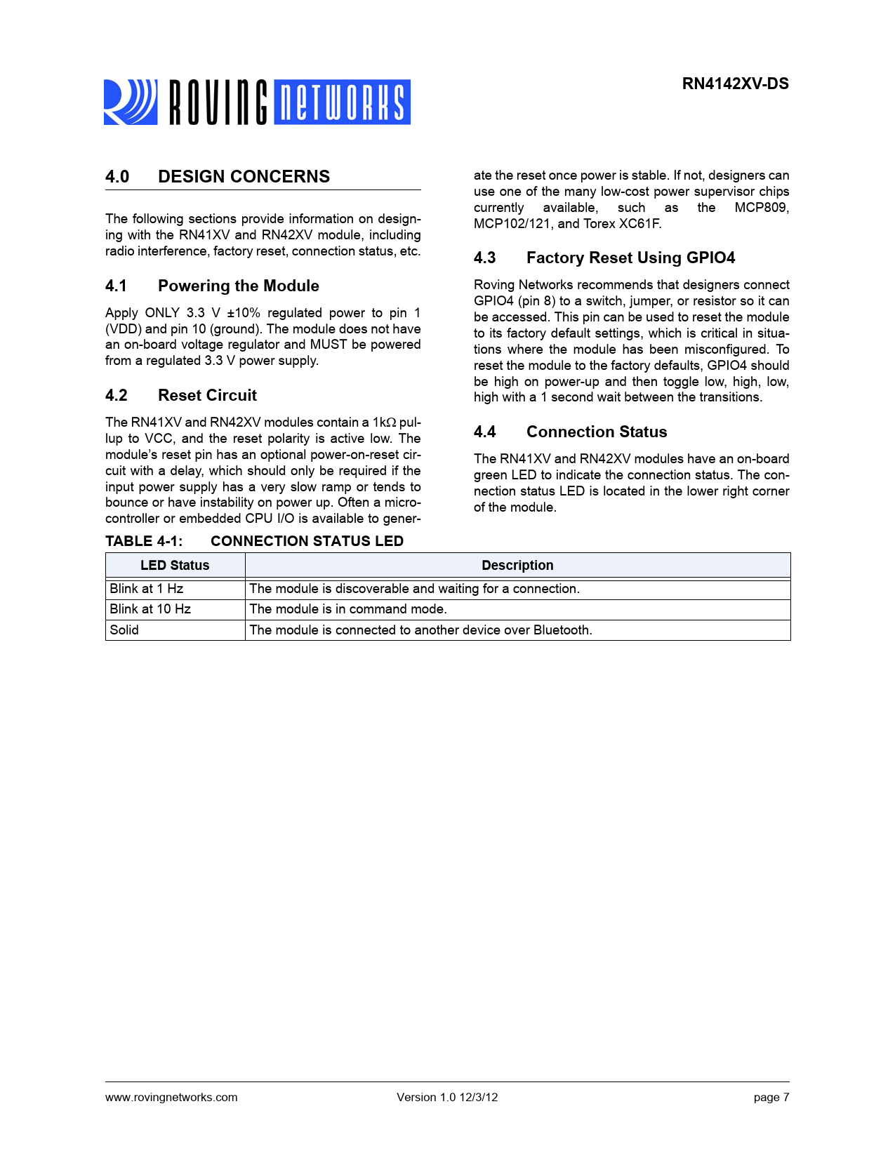 RN4142XV-DS4.0DESIGN CONCERNS ate the reset once power is stable. If not, designers can use one of the many low-cost power supervisor chips currently available, such as the MCP809, The following sections provide information on design- MCP102/121, and Torex XC61F. ing with the RN41XV and RN42XV module, including radio interference, factory reset, connection status, etc. 4.3Factory Reset Using GPIO44.1Powering the Module Roving Networks recommends that designers connect GPIO4 (pin 8) to a switch, jumper, or resistor so it can Apply ONLY 3.3 V ±10% regulated power to pin 1 be accessed. This pin can be used to reset the module (VDD) and pin 10 (ground). The module does not have to its factory default settings, which is critical in situa- an on-board voltage regulator and MUST be powered tions where the module has been misconfigured. To from a regulated 3.3 V power supply. reset the module to the factory defaults, GPIO4 should be high on power-up and then toggle low, high, low, 4.2Reset Circuit high with a 1 second wait between the transitions. The RN41XV and RN42XV modules contain a 1kΩ pul- lup to VCC, and the reset polarity is active low. The 4.4Connection Status module’s reset pin has an optional power-on-reset cir- The RN41XV and RN42XV modules have an on-board cuit with a delay, which should only be required if the green LED to indicate the connection status. The con- input power supply has a very slow ramp or tends to nection status LED is located in the lower right corner bounce or have instability on power up. Often a micro- of the module. controller or embedded CPU I/O is available to gener- TABLE 4-1:CONNECTION STATUS LEDLED StatusDescription Blink at 1 Hz The module is discoverable and waiting for a connection. Blink at 10 Hz The module is in command mode. Solid The module is connected to another device over Bluetooth. www.rovingnetworks.com Version 1.0 12/3/12 page 7 Document Outline Features: Applications: 1.0 Description 2.0 Overview FIGURE 2-1: RN41XV & RN42XV Dimensions 3.0 Typical Application Schematic FIGURE 3-1: Application Schematic, Note 1 4.0 Design Concerns 4.1 Powering the Module 4.2 Reset Circuit 4.3 Factory Reset Using GPIO4 4.4 Connection Status 5.0 Compliance Information 6.0 Ordering Information