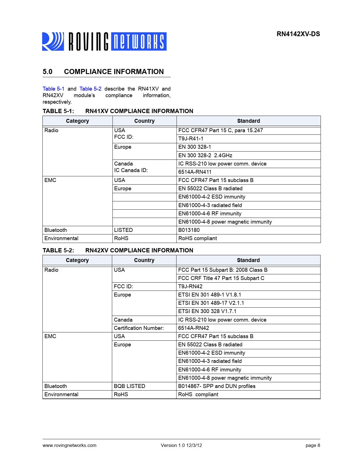Seiten / Seite10 / 8 — RN4142XV-DS. 5.0. COMPLIANCE INFORMATION. TABLE 5-1:. RN41XV COMPLIANCE …