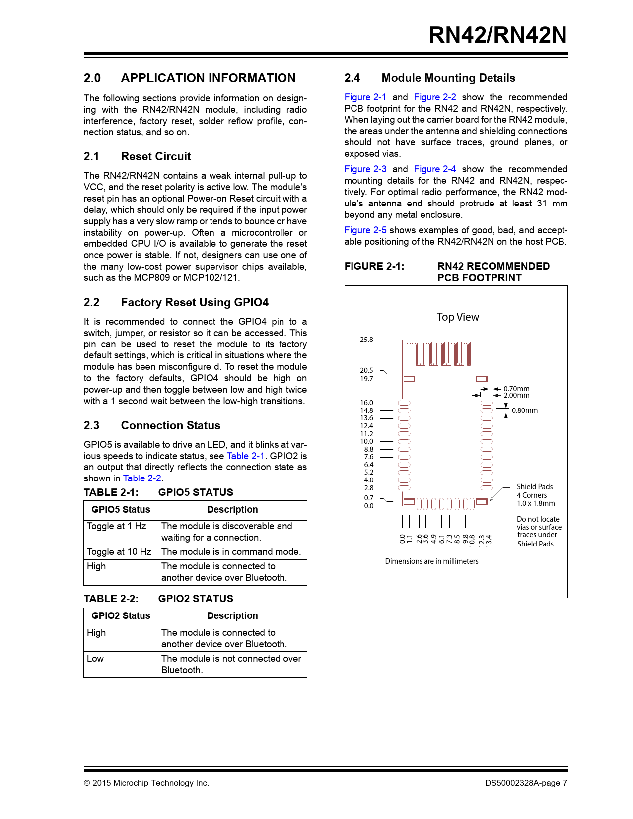 link to page 9 link to page 7 link to page 7 link to page 7 link to page 8 link to page 8 link to page 8 RN42/RN42N2.0APPLICATION INFORMATION2.4Module Mounting Details The following sections provide information on design- Figure 2-1 and Figure 2-2 show the recommended ing with the RN42/RN42N module, including radio PCB footprint for the RN42 and RN42N, respectively. interference, factory reset, solder reflow profile, con- When laying out the carrier board for the RN42 module, nection status, and so on. the areas under the antenna and shielding connections should not have surface traces, ground planes, or 2.1Reset Circuit exposed vias. Figure 2-3 and Figure 2-4 show the recommended The RN42/RN42N contains a weak internal pull-up to mounting details for the RN42 and RN42N, respec- VCC, and the reset polarity is active low. The module’s tively. For optimal radio performance, the RN42 mod- reset pin has an optional Power-on Reset circuit with a ule’s antenna end should protrude at least 31 mm delay, which should only be required if the input power beyond any metal enclosure. supply has a very slow ramp or tends to bounce or have instability on power-up. Often a microcontroller or Figure 2-5 shows examples of good, bad, and accept- embedded CPU I/O is available to generate the reset able positioning of the RN42/RN42N on the host PCB. once power is stable. If not, designers can use one of the many low-cost power supervisor chips available, FIGURE 2-1:RN42 RECOMMENDED such as the MCP809 or MCP102/121. PCB FOOTPRINT2.2Factory Reset Using GPIO4 It is recommended to connect the GPIO4 pin to a Top View switch, jumper, or resistor so it can be accessed. This pin can be used to reset the module to its factory 25.8 default settings, which is critical in situations where the module has been misconfigure d. To reset the module 20.5 to the factory defaults, GPIO4 should be high on 19.7 power-up and then toggle between low and high twice 0.70mm 2.00mm with a 1 second wait between the low-high transitions. 16.0 14.8 0.80mm 13.6 2.3Connection Status 12.4 11.2 GPIO5 is available to drive an LED, and it blinks at var- 10.0 8.8 ious speeds to indicate status, see Table 2-1. GPIO2 is 7.6 an output that directly reflects the connection state as 6.4 5.2 shown in Table 2-2. 4.0 TABLE 2-1:GPIO5 STATUS 2.8 Shield Pads 0.7 4 Corners 1.0 x 1.8mm GPIO5 StatusDescription 0.0 Do not locate Toggle at 1 Hz The module is discoverable and vias or surface waiting for a connection. traces under 0.0 1.1 2.6 3.6 4.9 6.1 7.3 8.5 9.8 10.8 12.3 13.4 Shield Pads Toggle at 10 Hz The module is in command mode. High The module is connected to Dimensions are in millimeters another device over Bluetooth. TABLE 2-2:GPIO2 STATUSGPIO2 StatusDescription High The module is connected to another device over Bluetooth. Low The module is not connected over Bluetooth. 2015 Microchip Technology Inc. DS50002328A-page 7 Document Outline Class 2 Bluetooth® Module with EDR Support Table of Contents 1.0 Device Overview 1.1 MCU Interface 1.2 ASCII Command and Data Interface TABLE 1-1: Environmental Conditions TABLE 1-2: Electrical Characteristics TABLE 1-3: Module Dimensions TABLE 1-4: Radio Characteristics TABLE 1-5: Digital I/O Characteristics TABLE 1-6: Pin Description 2.0 Application Information 2.1 Reset Circuit 2.2 Factory Reset Using GPIO4 2.3 Connection Status TABLE 2-1: GPIO5 Status TABLE 2-2: GPIO2 Status 2.4 Module Mounting Details 2.5 External Antenna Types (RN42N) 2.6 HCI Mode 2.7 Soldering Recommendations 2.8 SPI Interface 2.9 Bluetooth SIG QDID 2.10 Application Schematic 3.0 Regulatory Approval 3.1 United States 3.2 Canada 3.3 Europe TABLE 3-1: RN42 European Compliance Testing 3.4 Australia 3.5 New Zealand 3.6 Japan 3.7 Korea 3.8 Taiwan 4.0 Ordering Information TABLE 4-1: Ordering Information(1) Worldwide Sales and Service