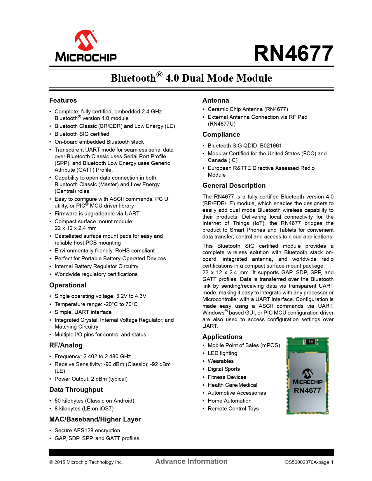 RN4677Bluetooth® 4.0 Dual Mode ModuleFeaturesAntenna • Complete, fully certified, embedded 2.4 GHz • Ceramic Chip Antenna (RN4677) Bluetooth® version 4.0 module • External Antenna Connection via RF Pad • Bluetooth Classic (BR/EDR) and Low Energy (LE) (RN4677U) • Bluetooth SIG certified Compliance • On-board embedded Bluetooth stack • Bluetooth SIG QDID: B021961 • Transparent UART mode for seamless serial data over Bluetooth Classic uses Serial Port Profile • Modular Certified for the United States (FCC) and (SPP), and Bluetooth Low Energy uses Generic Canada (IC) Attribute (GATT) Profile. • European R&TTE Directive Assessed Radio • Capability to open data connection in both Module Bluetooth Classic (Master) and Low Energy General Description (Central) roles • Easy to configure with ASCII commands, PC UI The RN4677 is a fully certified Bluetooth version 4.0 utility, or PIC® MCU driver library (BR/EDR/LE) module, which enables the designers to easily add dual mode Bluetooth wireless capability to • Firmware is upgradeable via UART their products. Delivering local connectivity for the • Compact surface mount module: Internet of Things (IoT), the RN4677 bridges the 22 x 12 x 2.4 mm product to Smart Phones and Tablets for convenient • Castellated surface mount pads for easy and data transfer, control and access to cloud applications. reliable host PCB mounting This Bluetooth SIG certified module provides a • Environmentally friendly, RoHS compliant complete wireless solution with Bluetooth stack on- • Perfect for Portable Battery-Operated Devices board, integrated antenna, and worldwide radio • Internal Battery Regulator Circuitry certifications in a compact surface mount package, • Worldwide regulatory certifications 22 x 12 x 2.4 mm. It supports GAP, SDP, SPP, and GATT profiles. Data is transferred over the Bluetooth Operational link by sending/receiving data via transparent UART mode, making it easy to integrate with any processor or • Single operating voltage: 3.2V to 4.3V Microcontroller with a UART interface. Configuration is • Temperature range: -20°C to 70°C made easy using a ASCII commands via UART. • Simple, UART interface Windows® based GUI, or PIC MCU configuration driver • Integrated Crystal, Internal Voltage Regulator, and are also used to access configuration settings over Matching Circuitry UART. • Multiple I/O pins for control and status ApplicationsRF/Analog • Mobile Point of Sales (mPOS) • Frequency: 2.402 to 2.480 GHz • LED lighting • Receive Sensitivity: -90 dBm (Classic); -92 dBm • Wearables (LE) • Digital Sports • Power Output: 2 dBm (typical) • Fitness Devices • Health Care/Medical Data Throughput • Automotive Accessories • 50 kilobytes (Classic on Android) • Home Automation • 8 kilobytes (LE on iOS7) • Remote Control Toys MAC/Baseband/Higher Layer • Secure AES128 encryption • GAP, SDP, SPP, and GATT profiles 2015 Microchip Technology Inc. Advance Information DS50002370A-page 1 Document Outline Bluetooth® 4.0 Dual Mode Module Features Operational RF/Analog Data Throughput MAC/Baseband/Higher Layer Antenna Compliance General Description Applications Table of Contents Most Current Data Sheet Errata Customer Notification System 1.0 Device Overview TABLE 1-1: RN4677 Module Family Types FIGURE 1-1: RN4677 Block Diagram 1.1 Interface Description FIGURE 1-2: RN4677 PIN Diagram FIGURE 1-3: RN4677U PIN Diagram TABLE 1-2: PIN Description 1.2 Configuring the RN4677 1.3 UART Interface 1.4 Control and Indication I/O Pins TABLE 1-3: Configuration And Indication I/O Assignments 1.5 Status Indication I/O Pins TABLE 1-4: Status Indication 1.6 Software Button (SW_BTN) 1.7 WAKE UP (WAKEUP) 1.8 RESET (RST_N) 1.9 Status LED (LED1) 1.10 System Configuration 1.11 Power TABLE 1-5: system configuration settings FIGURE 1-4: RN4677 To MCU Interface Example - LDO FIGURE 1-5: RN4677 To MCU Interface Example - Battery 1.12 Mounting Details 1.13 Soldering Recommendations FIGURE 1-6: RN4677 Module Dimensions FIGURE 1-7: RN4677 Recommended PCB Footprint FIGURE 1-8: RN4677 Host PCB Mounting Suggestion 2.0 Application Information 2.1 RN4677 Ceramic Chip Antenna FIGURE 2-1: RN4677 Antenna Radiation Pattern 2.2 External Configuration and Programming FIGURE 2-2: External Programming Header Connections 3.0 Regulatory Approval 3.1 United States 3.1.1 LABELING AND USER INFORMATION REQUIREMENTS 3.1.2 RF EXPOSURE 3.1.3 HELPFUL WEB SITES 3.2 Canada 3.2.1 LABELING AND USER INFORMATION REQUIREMENTS 3.2.2 RF EXPOSURE 3.2.3 APPROVED EXTERNAL ANTENNA TYPES 3.2.4 HELPFUL WEB SITES 3.3 Europe 3.3.1 LABELING AND USER INFORMATION REQUIREMENTS 3.3.2 EXTERNAL ANTENNA REQUIREMENTS 3.3.3 HELPFUL WEB SITES TABLE 3-1: European Compliance Testing 4.0 Electrical Characteristics TABLE 4-1: Environmental Conditions TABLE 4-2: Electrical Characteristics TABLE 4-3: Supply Consumption-Classic(1) TABLE 4-4: Supply Consumption-low Energy(1) TABLE 4-5: UART Baud 5.0 Ordering Information TABLE 5-1: Ordering Information Appendix A: Revision History Revision A (May 2015) The Microchip Web Site Customer Change Notification Service Customer Support Product Identification System Worldwide Sales and Service