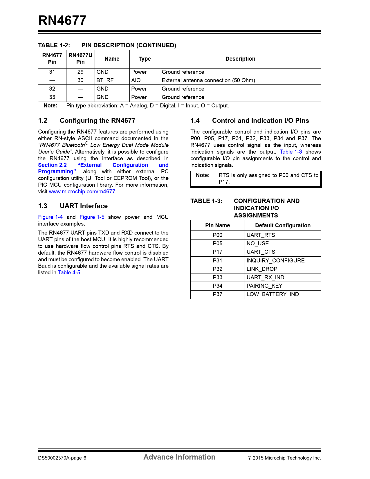 1.2 Configuring the RN4677 1.4 Control and Indication I/O Pins