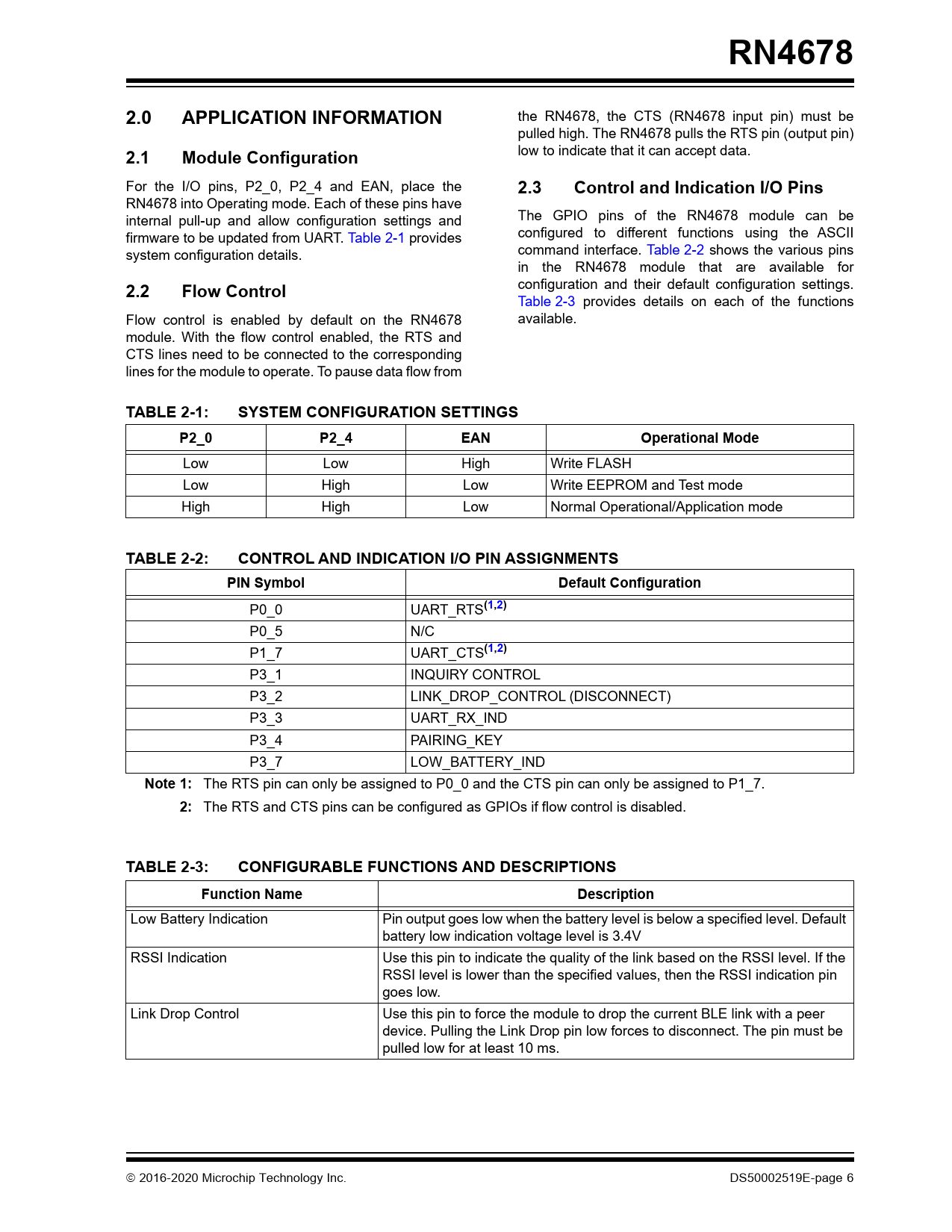 RN4678 2.0 APPLICATION INFORMATION 2.1 Module Configuration 2.3 Control and Indication I/O Pins 2.2 Flow Control TABLE 2-1:
