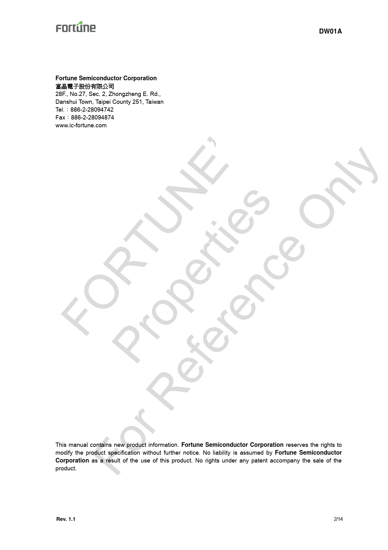 DW01A FO Fo P R r R ro TU ef pe NE er rti en es y Fortune Semiconductor Corporation 富晶電子股份有限公司