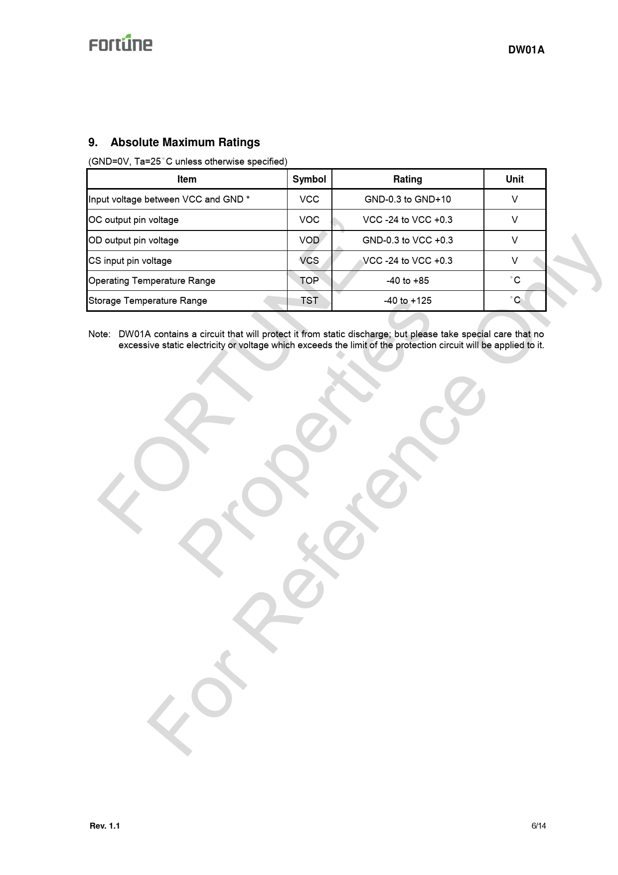 DW01A 9. Absolute Maximum Ratings (GND=0V, Ta=25°C unless otherwise specified) Symbol Rating Unit Input voltage between VCC and GND * VCC GND-0.3 to GND+10 V OC output pin voltage VOC VCC -24 to VCC +0.3 V OD output pin voltage VOD GND-0.3 to VCC +0.3 V FO Fo P R r R ro TU ef pe NE er rti ’ en es ce O nl y Item CS input pin voltage VCS VCC -24 to VCC +0.3 V Operating Temperature Range TOP -40 to +85 °C Storage Temperature Range TST -40 to +125 °C Note: DW01A contains a circuit that will protect it from static discharge; but please take special care that no excessive static electricity or voltage which exceeds the limit of the protection circuit will be applied to it. Rev. 1.1 6/14