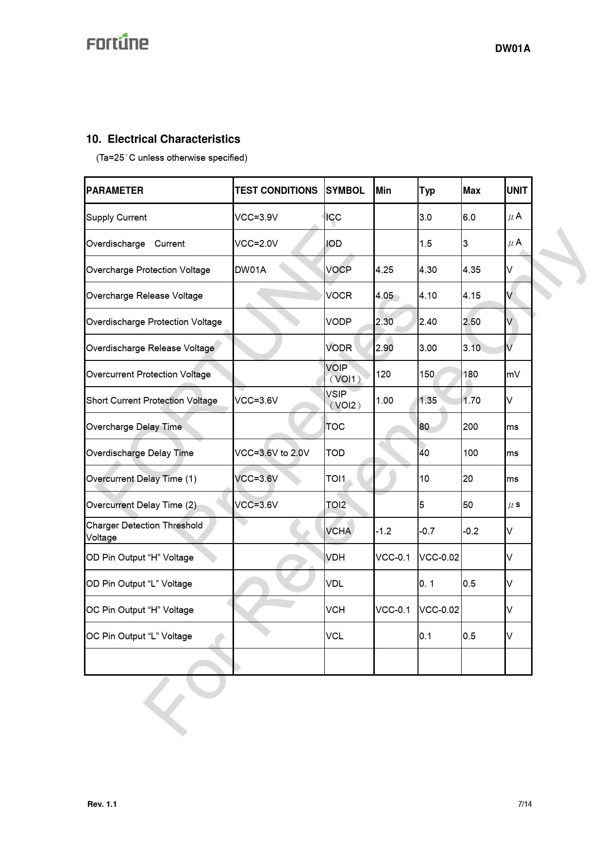 DW01A 10. Electrical Characteristics (Ta=25°C unless otherwise specified) PARAMETER TEST CONDITIONS SYMBOL Supply Current VCC=3.9V Typ Max UNIT ICC 3.0 6.0 μA VCC=2.0V IOD 1.5 3 μA DW01A VOCP 4.25 4.30 4.35 V Overcharge Release Voltage VOCR 4.05 4.10 4.15 V Overdischarge Protection Voltage VODP 2.30 2.40 2.50 V Overdischarge Release Voltage VODR 2.90 3.00 3.10 V Overcurrent Protection Voltage VOIP (VOI1) 120 150 180 mV VSIP (VOI2) 1.00 1.35 1.70 V TOC 80 200 ms Current FO Fo P R r R ro TU ef pe NE er rti ’ en es ce O nl y Overdischarge Min Overcharge Protection Voltage Short Current Protection Voltage VCC=3.6V Overcharge Delay Time Overdischarge Delay Time VCC=3.6V to 2.0V TOD 40 100 ms Overcurrent Delay Time (1) VCC=3.6V TOI1 10 20 ms Overcurrent Delay Time (2) VCC=3.6V TOI2 5 50 μs -0.7 -0.2 V Charger Detection Threshold Voltage VCHA -1.2 OD Pin Output “H” Voltage VDH VCC-0.1 VCC-0.02 OD Pin Output “L” Voltage VDL OC Pin Output “H” Voltage VCH OC Pin Output “L” Voltage VCL Rev. 1.1 0. 1 V 0.5 VCC-0.1 VCC-0.02 0.1 V V 0.5 V 7/14