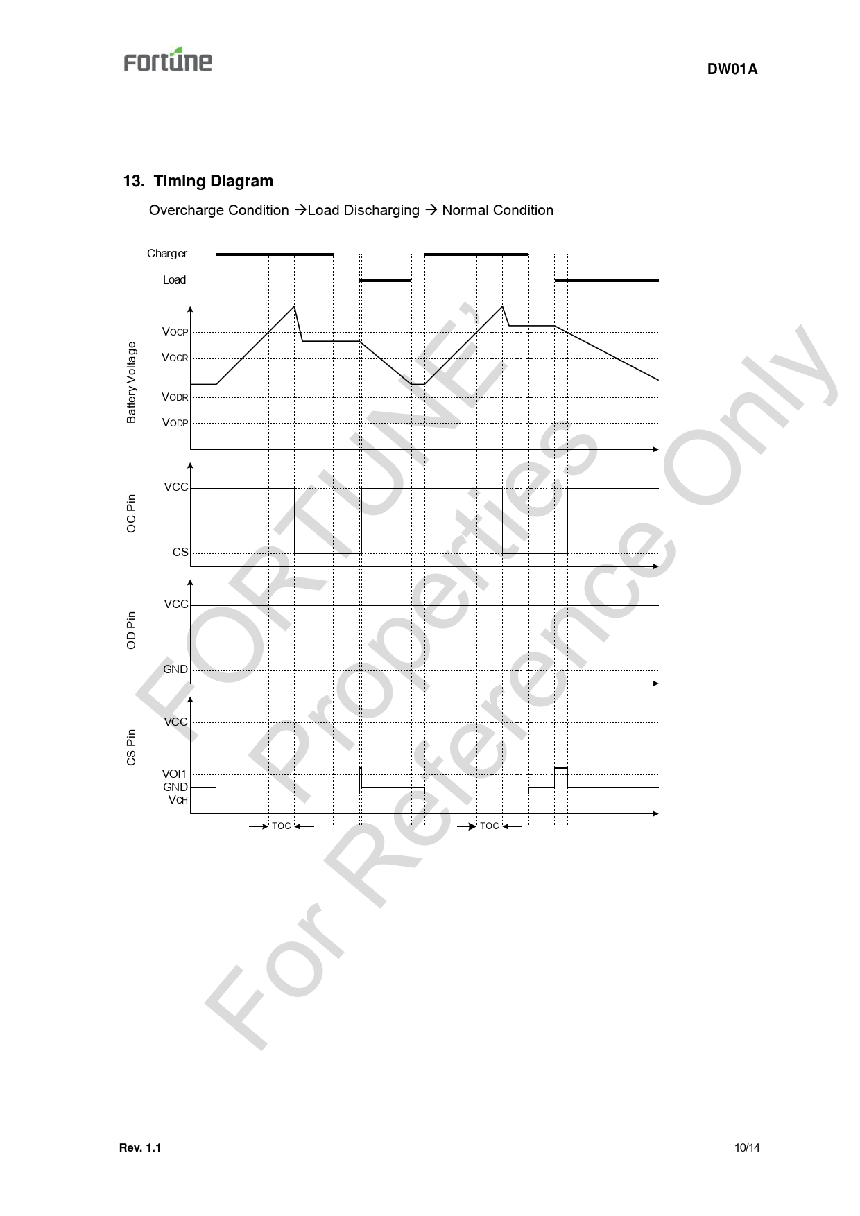 DW01A 13. Timing Diagram Overcharge Condition Load Discharging Normal Condition Charger Load FO Fo P R r R ro TU ef pe NE er rti ’ en es ce O nl y Battery Voltage VOCP VOCR OC Pin VODR VODP VCC OD Pin CS VCC CS Pin GND VCC VOI1 GND VCH TOC Rev. 1.1 TOC 10/14