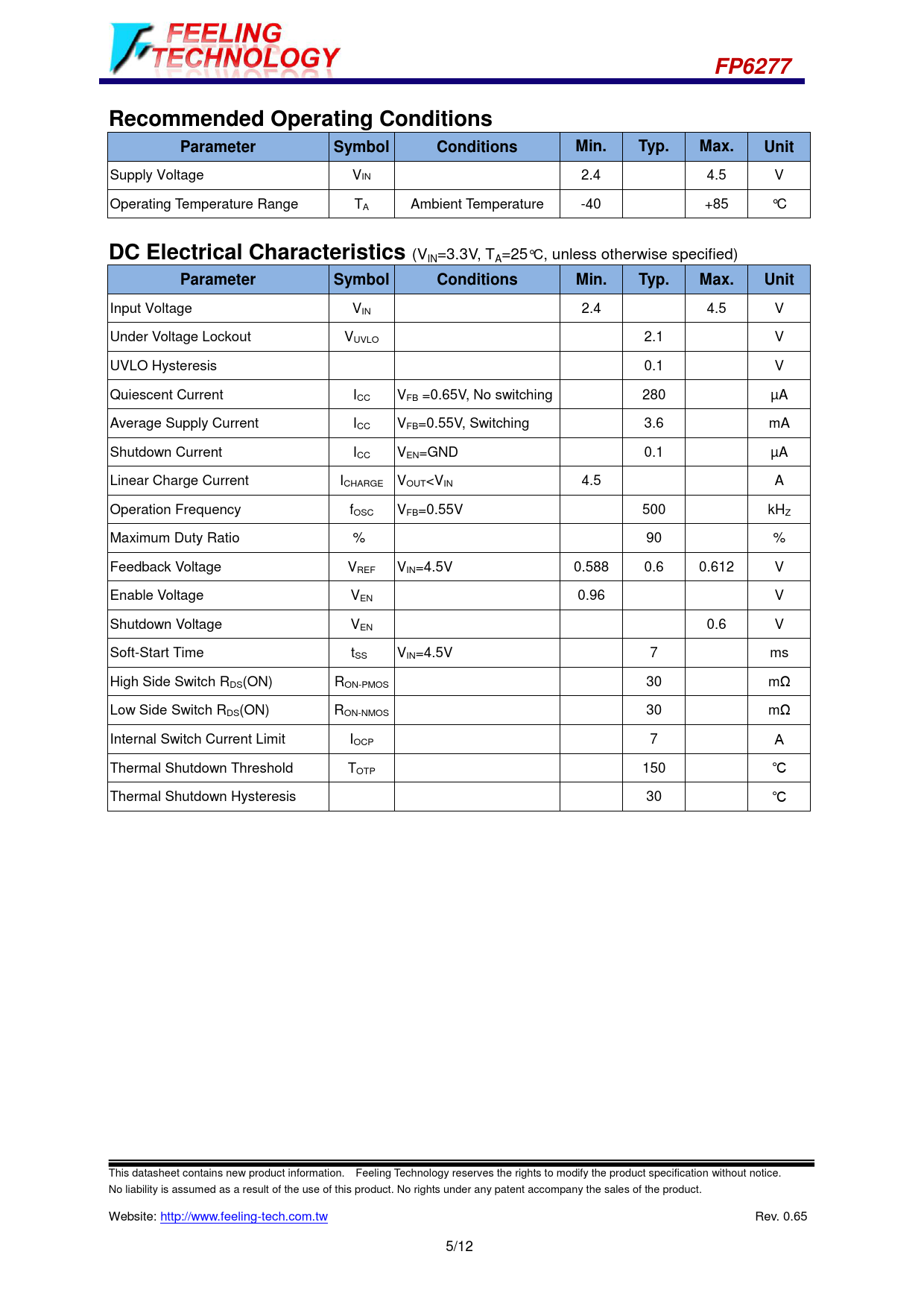 FP6277 Recommended Operating Conditions Parameter Symbol Supply Voltage VIN Operating Temperature Range TA Conditions Ambient Temperature Min. Typ. Max. Unit 2.4 4.5 V -40 +85 °C DC Electrical Characteristics (VIN=3.3V, TA=25°C, unless otherwise specified) Parameter Input Voltage Under Voltage Lockout Symbol Conditions VIN Min. Typ. 2.4 VUVLO UVLO Hysteresis Max. Unit 4.5 V 2.1 V 0.1 V Quiescent Current ICC VFB =0.65V, No switching 280 µA Average Supply Current ICC VFB=0.55V, Switching 3.6 mA Shutdown Current ICC VEN=GND 0.1 µA Linear Charge Current ICHARGE VOUT
