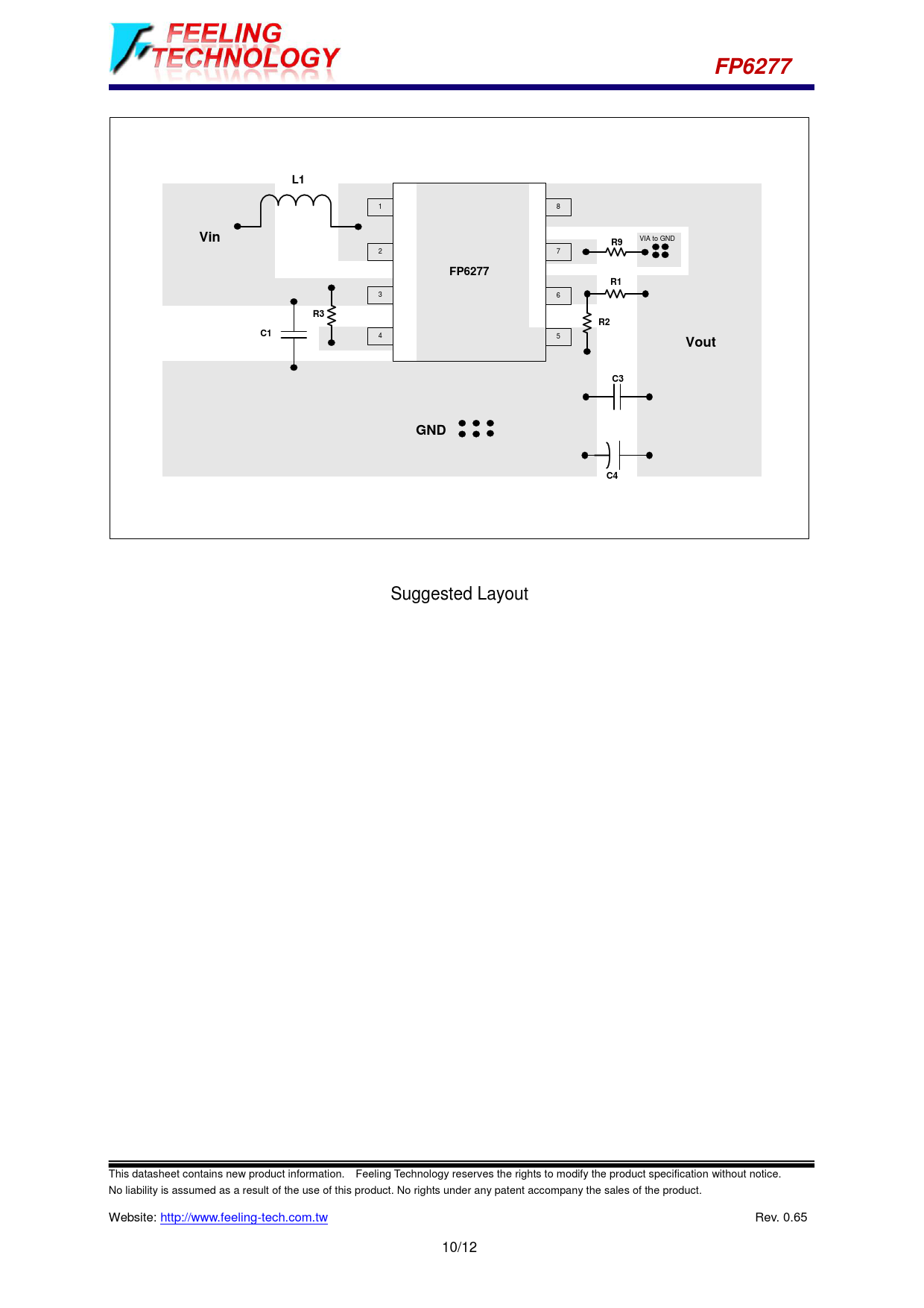 FP6277 L1 1 8 2 7 Vin R9 VIA to GND FP6277 R1 3 6 4 5 R3 C1 R2 Vout C3 GND C4 Suggested Layout This datasheet contains new product information. Feeling Technology reserves the rights to modify the product specification without notice. No liability is assumed as a result of the use of this product. No rights under any patent accompany the sales of the product. Website: http://www.feeling-tech.com.tw Rev. 0.65 10/12