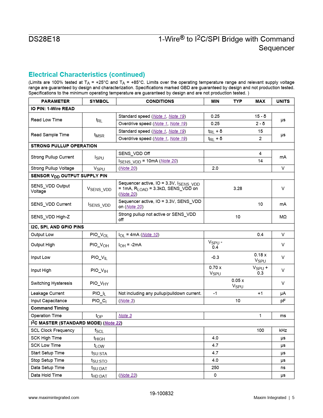 link to page 7 link to page 8 link to page 7 link to page 8 link to page 7 link to page 8 link to page 7 link to page 8 link to page 8 link to page 8 link to page 8 link to page 8 link to page 7 link to page 7 link to page 7 link to page 8 link to page 8 DS28E18 1-Wire® to I2C/SPI Bridge with Command Sequencer Electrical Characteristics (continued) (Limits are 100% tested at TA = +25°C and TA = +85°C. Limits over the operating temperature range and relevant supply voltage range are guaranteed by design and characterization. Specifications marked GBD are guaranteed by design and not production tested. Specifications to the minimum operating temperature are guaranteed by design and are not production tested. ) PARAMETERSYMBOLCONDITIONSMINTYPMAXUNITSIO PIN: 1-Wire READ Standard speed (Note 1, Note 19) 0.25 15 - δ Read Low Time tRL μs Overdrive speed (Note 1, Note 19) 0.25 2 - δ Standard speed (Note 1, Note 19) tRL + δ 15 Read Sample Time tMSR μs Overdrive speed (Note 1, Note 19) tRL + δ 2 STRONG PULLUP OPERATION SENS_VDD Off 4 Strong Pullup Current ISPU mA ISENS_VDD = 10mA (Note 20) 14 Strong Pullup Voltage VSPU (Note 20) 2.0 V SENSOR VDD OUTPUT SUPPLY PIN Sequencer active, IO = 3.3V, I SENS_VDD Output SENS_VDD V = 1mA, R 3.28 V Voltage SENS_VDD LOAD = 3.3kΩ, SENS_VDD on (Note 20) Sequencer active, IO = 3.3V, SENS_VDD SENS_VDD Current ISENS_VDD 10 mA on (Note 20) Strong pullup not active or SENS_VDD SENS_VDD High-Z 10 MΩ off I2C, SPI, AND GPIO PINS Output Low PIO_VOL IOL = 4mA (Note 10) 0.4 V V Output High PIO_V SPU - OH IOH = -2mA V 0.4 0.18 x Input Low PIO_VIL -0.3 V VSPU 0.70 x V Input High PIO_V SPU + IH V VSPU 0.3 0.05 x Switching Hysteresis PIO_VHY V VSPU Leakage Current PIO_IL Not including any pullup/pulldown current. -1 +1 μA Input Capacitance PIO_CI (Note 3) 10 pF Command Timing Operation Time tOP Note 3 1 ms I2C MASTER (STANDARD MODE) (Note 22) SCL Clock Frequency fSCL 100 kHz SCK High Time tHIGH 4.0 μs SCK Low Time tLOW 4.7 μs Start Setup Time tSU:STA 4.7 μs Stop Setup Time tSU:STO 4.0 μs Data Setup Time tSU:DAT 250 ns Data Hold Time tHD:DAT (Note 23) 0 μs 19-100832 www.maximintegrated.com Maxim Integrated | 5 Document Outline General Description Applications Benefits and Features Simplified Application Block Diagram Absolute Maximum Ratings Package Information 8 TDFN-EP Electrical Characteristics Electrical Characteristics (continued) Typical Operating Characteristics Pin Configuration DS28E18 Pin Description Functional Diagram Block Diagram Detailed Description 64-Bit ROM ID Power-Up ROM ID Serialization 1-Wire Bus System Hardware Configuration Transaction Sequence Initialization 1-Wire ROM Function Commands Search ROM [F0h] Read ROM [33h] Match ROM [55h] Skip ROM [CCh] Resume [A5h] Overdrive-Skip ROM [3Ch] Overdrive-Match ROM [69h] 1-Wire Signaling and Timing Read/Write Time Slots Master-to-Slave Slave-to-Master Improved Network Behavior Device Function Commands Command Start (66h) Write Sequencer Command (11h) Read Sequencer Command (22h) Run Sequencer Command (33h) Device Configuration and Status Commands Write Configuration Command (55h) Read Configuration Command (6Ah) Write GPIO Configuration (83h) Read GPIO Configuration (7Ch) Device Status Command (7Ah) Sequencer Commands I2C Sequencer Interface Commands I2C Start Command I2C Stop Command I2C Write Data Command I2C Read Data Command I2C Read Data with NACK End Command SPI Sequencer Commands SPI Write/Read Byte(s) Command SPI Write/Read Bit(s) Command SS_HIGH Command SS_LOW Command Sequencer Utility Commands GPIO_CTRL Write Command GPIO_CTRL Read Command GPIO_BUF Write Command GPIO_BUF Read Command Delay Command SENS_VDD On Command SENS_VDD Off Command I2C Overview I2C Definitions Bus Idle or Not Busy START Condition STOP Condition Repeated START Condition Data Valid SPI Overview SPI Timing SPI Timing Diagram Power-Up of GPIO/I2C Pins Timeout Typical Application Circuits DS28E18 Configured as an I2C Master Typical Application Circuits (continued) DS28E18 Configured as an SPI Master Ordering Information Revision History