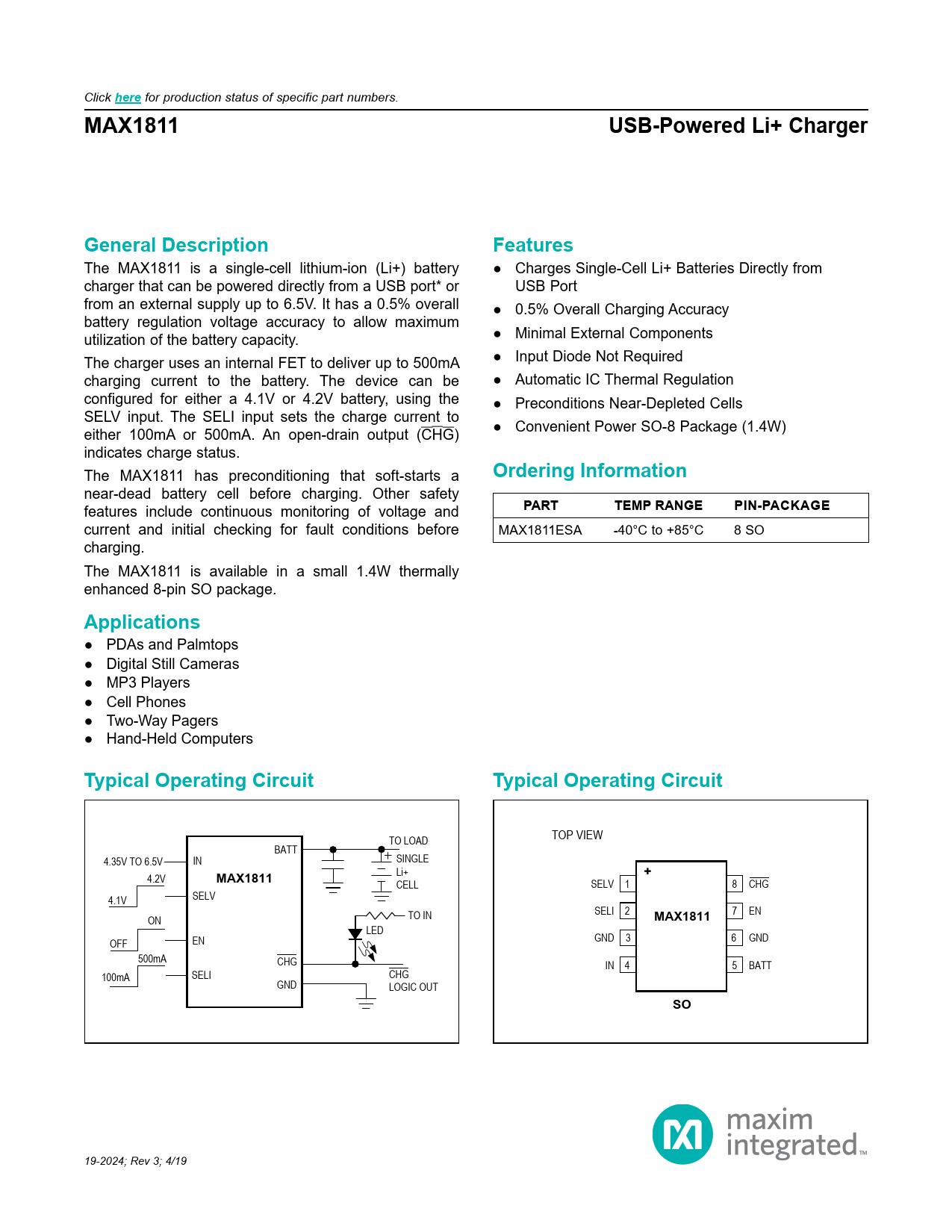 here. MAX1811. USB-Powered Li+ Charger. General Description. Features. Ordering Information. PART. TEMP RANGE. PIN-PACKAGE. Applications