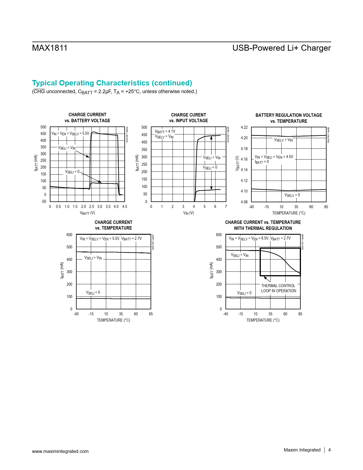 600 600 VIN = VSELV = VEN = 5.5V, VBATT = 2.7V VIN = VSELV = VEN = 6.5V, VBATT = 2.7V 500 500 MAX1811 toc07 MAX1811 toc08 VSELI = VIN 400 VSELI = VIN 400 (mA) 300 (mA) 300 I BATT I BATT 200 200 THERMAL CONTROL V LOOP IN OPERATION SELI = 0 VSELI = 0 100 100 0 0 -40 -15 10 35 60 85 -40 -15 10 35 60 85 TEMPERATURE (°C) TEMPERATURE (°C) www.maximintegrated.com Maxim Integrated │ 4