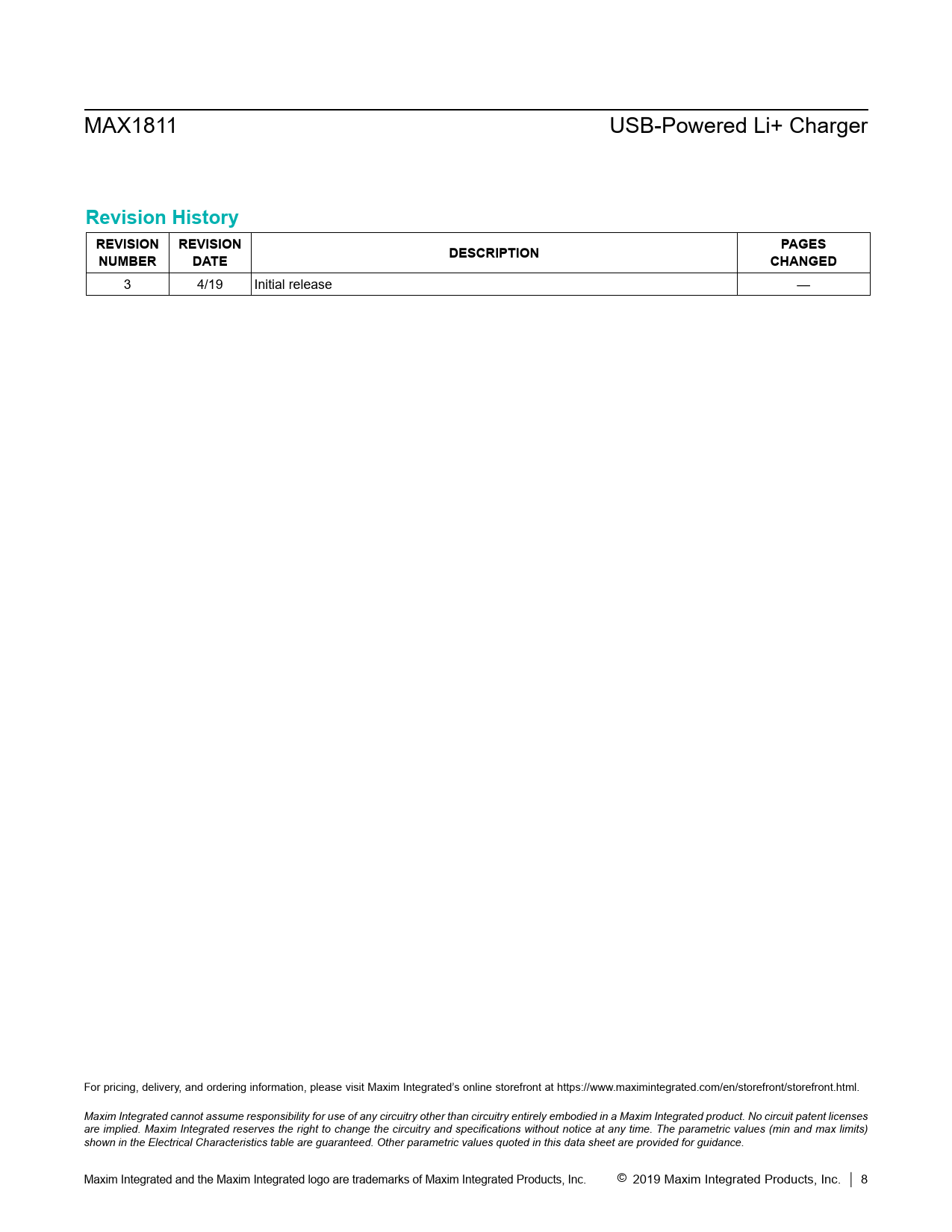 3 4/19 Initial release — For pricing, delivery, and ordering information, please visit Maxim Integrated’s online storefront at https://www.maximintegrated.com/en/storefront/storefront.html. Maxim Integrated cannot assume responsibility for use of any circuitry other than circuitry entirely embodied in a Maxim Integrated product. No circuit patent licenses are implied. Maxim Integrated reserves the right to change the circuitry and specifications without notice at any time. The parametric values (min and max limits) shown in the Electrical Characteristics table are guaranteed. Other parametric values quoted in this data sheet are provided for guidance. Maxim Integrated and the Maxim Integrated logo are trademarks of Maxim Integrated Products, Inc. © 2019 Maxim Integrated Products, Inc. │ 8