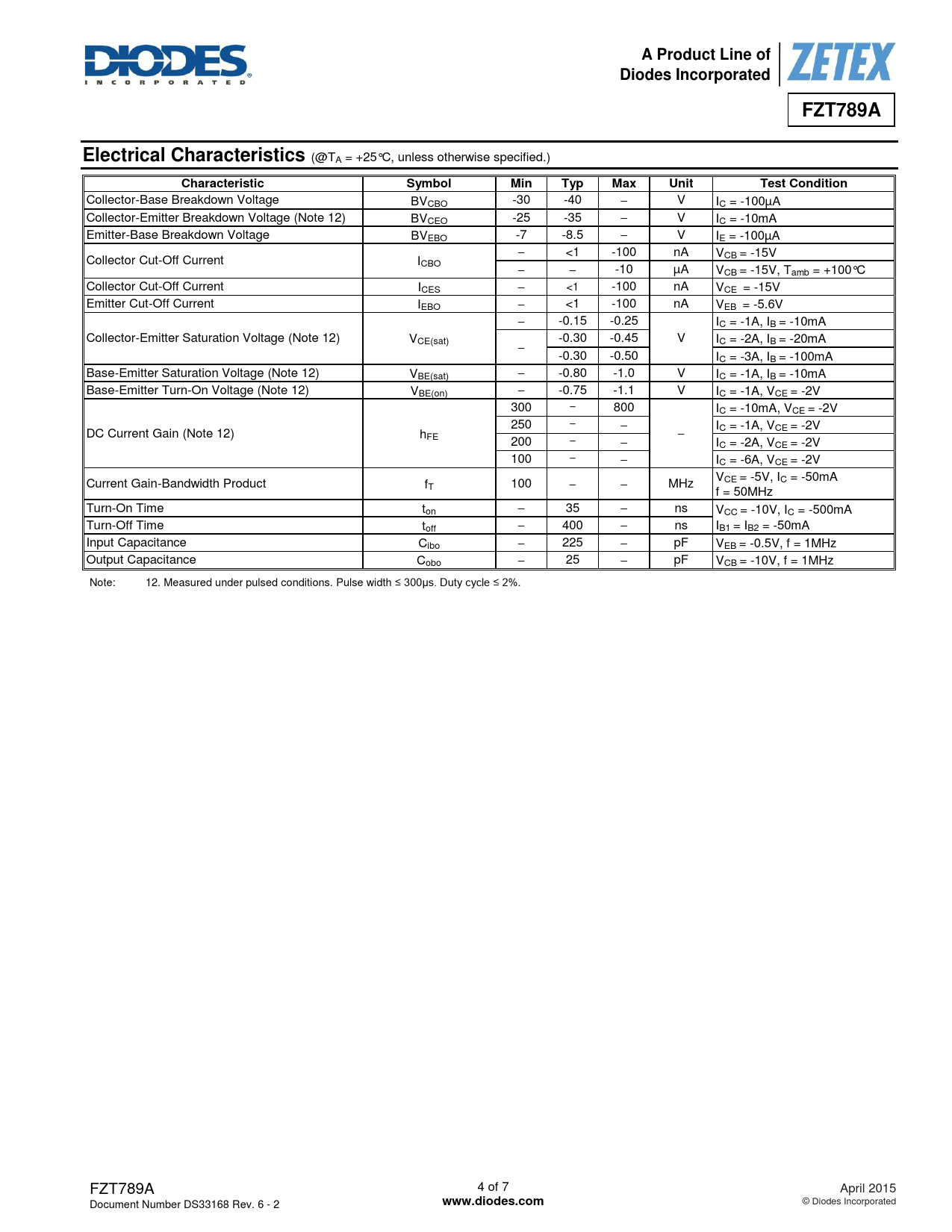 A Product Line of. Diodes Incorporated. FZT789A. Electrical Characteristics. Characteristic. Symbol. Min. Typ. Max. Unit. Test Condition