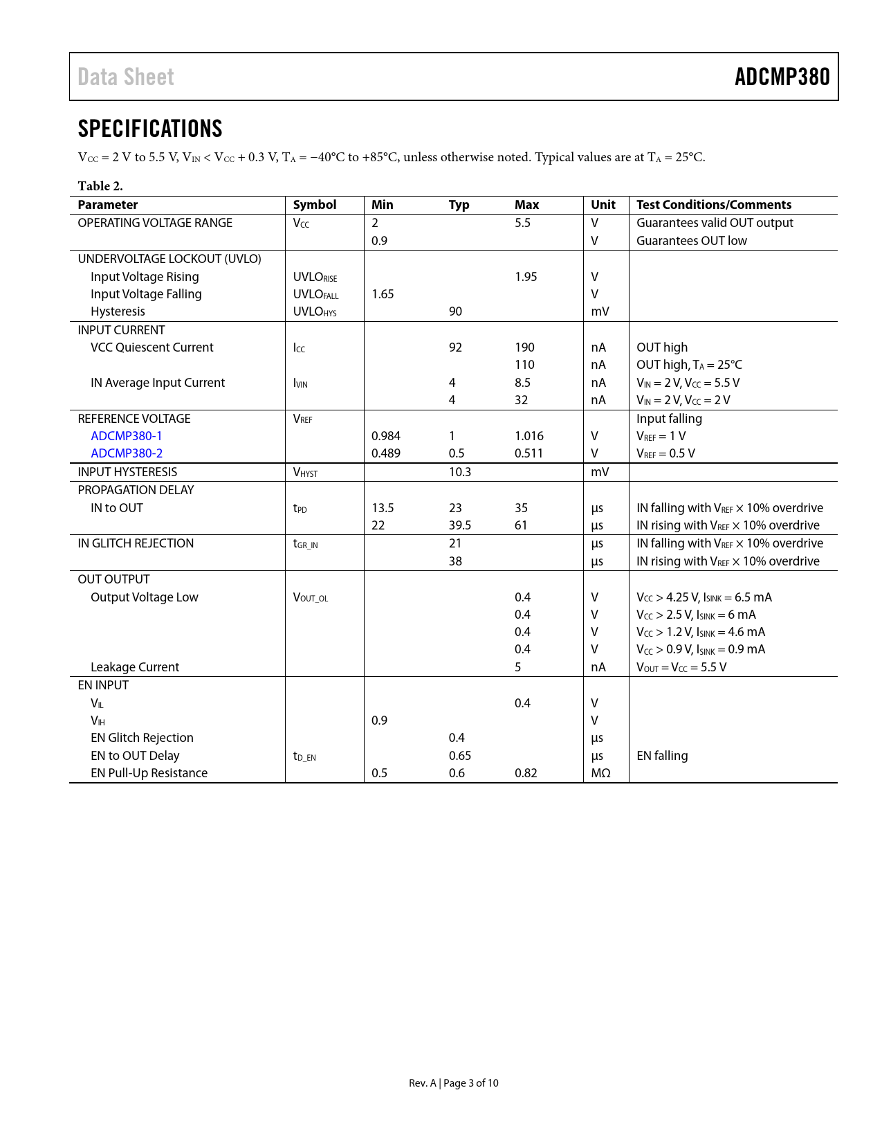 Data Sheet ADCMP380 SPECIFICATIONS Table 2 Parameter Symbol Min Typ Max Unit Test Conditions/Comments