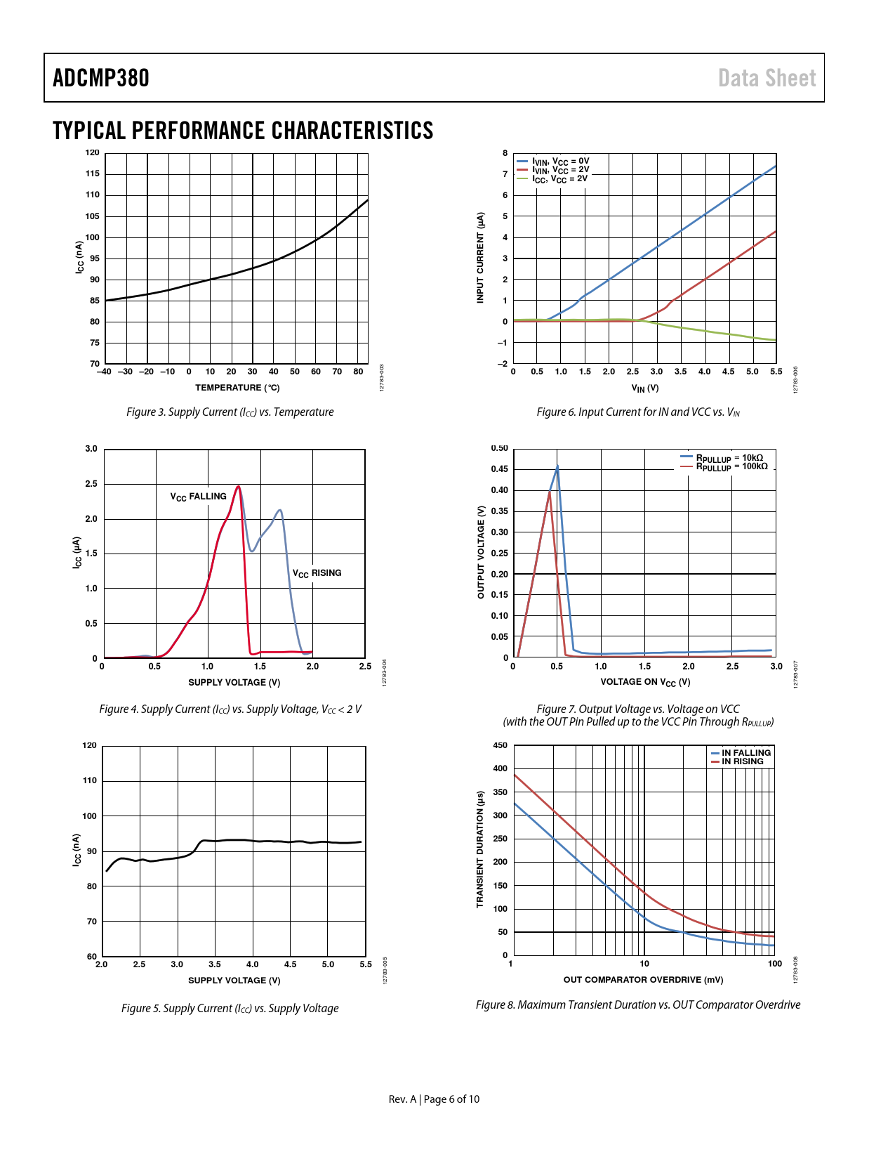 ADCMP380Data SheetTYPICAL PERFORMANCE CHARACTERISTICS1208IVIN, VCC = 0VI1157VIN, VCC = 2VICC, VCC = 2V11061055A) µ (100)4NTA (n953I CCCURRE902UT85INP180075–170–2–40 –30 –20 –1001020304050607080 003 00.51.01.52.02.53.03.54.04.55.05.5 006 TEMPERATURE (°C) 12783- VIN (V) 12783- Figure 3. Supply Current (ICC) vs. Temperature Figure 6. Input Current for IN and VCC vs. VIN 3.00.50RPULLUP = 10kΩ0.45RPULLUP = 100kΩ2.50.40VCC FALLING0.352.0E (V) G 0.30AA) µLT( 1.5O 0.25I CCT VVUCC RISING0.20TP1.0OU 0.150.100.50.050000.51.01.52.02.5 004 00.51.01.52.02.53.0 007 SUPPLY VOLTAGE (V)VOLTAGE ON V 12783- CC (V) 12783- Figure 4. Supply Current (ICC) vs. Supply Voltage, VCC < 2 V Figure 7. Output Voltage vs. Voltage on VCC (with the OUT Pin Pulled up to the VCC Pin Through RPULLUP) 120450IN FALLING IN RISING400110)350s µ (100300TION AA)250n (90DURI CC200NT IE80150RANS T10070506002.02.53.03.54.04.55.05.5 005 110100 008 SUPPLY VOLTAGE (V)OUT COMPARATOR OVERDRIVE (mV) 12783- 12783- Figure 5. Supply Current (I Figure 8. Maximum Transient Duration vs. OUT Comparator Overdrive CC) vs. Supply Voltage Rev. A | Page 6 of 10 Document Outline FEATURES APPLICATIONS FUNCTIONAL BLOCK DIAGRAM GENERAL DESCRIPTION REVISION HISTORY SPECIFICATIONS ABSOLUTE MAXIMUM RATINGS THERMAL RESISTANCE ESD CAUTION PIN CONFIGURATION AND FUNCTION DESCRIPTIONS TYPICAL PERFORMANCE CHARACTERISTICS THEORY OF OPERATION TRANSIENT IMMUNITY OUTPUT EN INPUT ADDING HYSTERESIS DEVICE OPTIONS OUTLINE DIMENSIONS ORDERING GUIDE