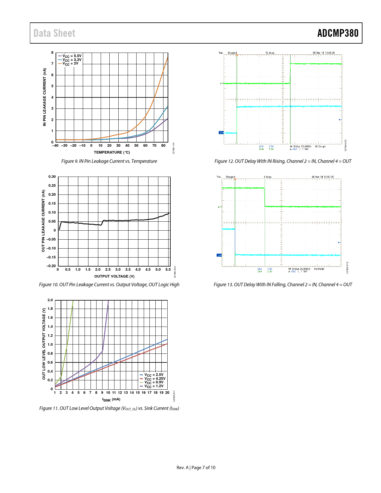 Data SheetADCMP3808VCC = 5.5VVCC = 3.3V7VCC = 2VA) n (6NT5CURRE E4AKAG3EIN L2IN P10 012 –40 –30 –20 –1001020304050607080 14 1 TEMPERATURE (°C) 12783- 12783- Figure 9. IN Pin Leakage Current vs. Temperature Figure 12. OUT Delay With IN Rising, Channel 2 = IN, Channel 4 = OUT 0.300.25A) n0.20( NT0.150.10CURRE E0.05AKAG0EIN L –0.05 P UT –0.10O–0.15–0.20 013 00.51.01.52.02.53.03.54.04.55.05.5 010 12783- OUTPUT VOLTAGE (V) 12783- Figure 10. OUT Pin Leakage Current vs. Output Voltage, OUT Logic High Figure 13. OUT Delay With IN Falling, Channel 2 = IN, Channel 4 = OUT 2.01.8E (V) G 1.6A LT 1.4OT V 1.2U TP 1.0OU L E 0.8V0.60.4T LOW LEVCC = 2.5VOUV0.2CC = 4.25VVCC = 0.9VVCC = 1.2V0 1 2 3 4 5 6 7 8 9 10 11 12 13 14 15 16 17 18 19 20 110 ISINK (mA) 12783- Figure 11. OUT Low Level Output Voltage (VOUT_OL) vs. Sink Current (ISINK) Rev. A | Page 7 of 10 Document Outline FEATURES APPLICATIONS FUNCTIONAL BLOCK DIAGRAM GENERAL DESCRIPTION REVISION HISTORY SPECIFICATIONS ABSOLUTE MAXIMUM RATINGS THERMAL RESISTANCE ESD CAUTION PIN CONFIGURATION AND FUNCTION DESCRIPTIONS TYPICAL PERFORMANCE CHARACTERISTICS THEORY OF OPERATION TRANSIENT IMMUNITY OUTPUT EN INPUT ADDING HYSTERESIS DEVICE OPTIONS OUTLINE DIMENSIONS ORDERING GUIDE