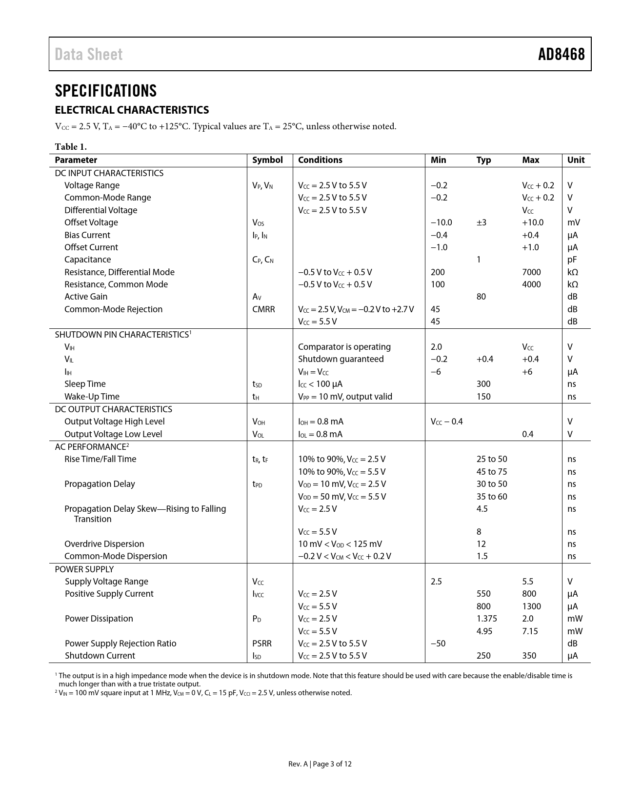 Data SheetAD8468SPECIFICATIONS ELECTRICAL CHARACTERISTICS VCC = 2.5 V, TA = −40°C to +125°C. Typical values are TA = 25°C, unless otherwise noted. Table 1. Parameter SymbolConditionsMinTypMaxUnit DC INPUT CHARACTERISTICS Voltage Range VP, VN VCC = 2.5 V to 5.5 V −0.2 VCC + 0.2 V Common-Mode Range VCC = 2.5 V to 5.5 V −0.2 VCC + 0.2 V Differential Voltage VCC = 2.5 V to 5.5 V VCC V Offset Voltage VOS −10.0 ±3 +10.0 mV Bias Current IP, IN −0.4 +0.4 μA Offset Current −1.0 +1.0 μA Capacitance CP, CN 1 pF Resistance, Differential Mode −0.5 V to VCC + 0.5 V 200 7000 kΩ Resistance, Common Mode −0.5 V to VCC + 0.5 V 100 4000 kΩ Active Gain AV 80 dB Common-Mode Rejection CMRR VCC = 2.5 V, VCM = −0.2 V to +2.7 V 45 dB VCC = 5.5 V 45 dB SHUTDOWN PIN CHARACTERISTICS1 VIH Comparator is operating 2.0 VCC V VIL Shutdown guaranteed −0.2 +0.4 +0.4 V IIH VIH = VCC −6 +6 μA Sleep Time tSD lCC < 100 μA 300 ns Wake-Up Time tH VPP = 10 mV, output valid 150 ns DC OUTPUT CHARACTERISTICS Output Voltage High Level VOH IOH = 0.8 mA VCC − 0.4 V Output Voltage Low Level VOL IOL = 0.8 mA 0.4 V AC PERFORMANCE2 Rise Time/Fall Time tR, tF 10% to 90%, VCC = 2.5 V 25 to 50 ns 10% to 90%, VCC = 5.5 V 45 to 75 ns Propagation Delay tPD VOD = 10 mV, VCC = 2.5 V 30 to 50 ns VOD = 50 mV, VCC = 5.5 V 35 to 60 ns Propagation Delay Skew—Rising to Falling VCC = 2.5 V 4.5 ns Transition VCC = 5.5 V 8 ns Overdrive Dispersion 10 mV < VOD < 125 mV 12 ns Common-Mode Dispersion −0.2 V < VCM < VCC + 0.2 V 1.5 ns POWER SUPPLY Supply Voltage Range VCC 2.5 5.5 V Positive Supply Current IVCC VCC = 2.5 V 550 800 μA VCC = 5.5 V 800 1300 μA Power Dissipation PD VCC = 2.5 V 1.375 2.0 mW VCC = 5.5 V 4.95 7.15 mW Power Supply Rejection Ratio PSRR VCC = 2.5 V to 5.5 V −50 dB Shutdown Current ISD VCC = 2.5 V to 5.5 V 250 350 μA 1 The output is in a high impedance mode when the device is in shutdown mode. Note that this feature should be used with care because the enable/disable time is much longer than with a true tristate output. 2 VIN = 100 mV square input at 1 MHz, VCM = 0 V, CL = 15 pF, VCCI = 2.5 V, unless otherwise noted. Rev. A | Page 3 of 12 Document Outline FEATURES APPLICATIONS FUNCTIONAL BLOCK DIAGRAM GENERAL DESCRIPTION REVISION HISTORY SPECIFICATIONS ELECTRICAL CHARACTERISTICS ABSOLUTE MAXIMUM RATINGS THERMAL RESISTANCE ESD CAUTION PIN CONFIGURATION AND FUNCTION DESCRIPTIONS TYPICAL PERFORMANCE CHARACTERISTICS APPLICATIONS INFORMATION POWER/GROUND LAYOUT AND BYPASSING TTL-/CMOS-COMPATIBLE OUTPUT STAGE OPTIMIZING PERFORMANCE COMPARATOR PROPAGATIONDELAY DISPERSION CROSSOVER BIAS POINT MINIMUM INPUT SLEW RATE REQUIREMENT TYPICAL APPLICATION CIRCUITS OUTLINE DIMENSIONS ORDERING GUIDE AUTOMOTIVE PRODUCTS