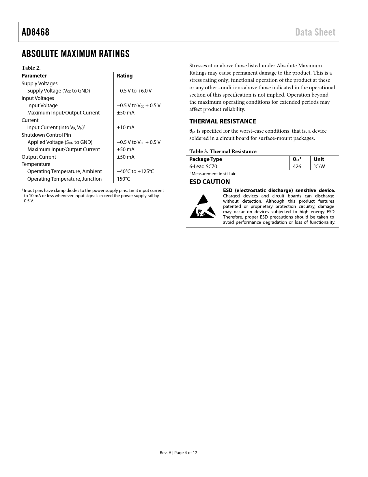 AD8468. Data Sheet. ABSOLUTE MAXIMUM RATINGS Table 2. Parameter. Rating. THERMAL RESISTANCE. Table 3. Thermal Resistance