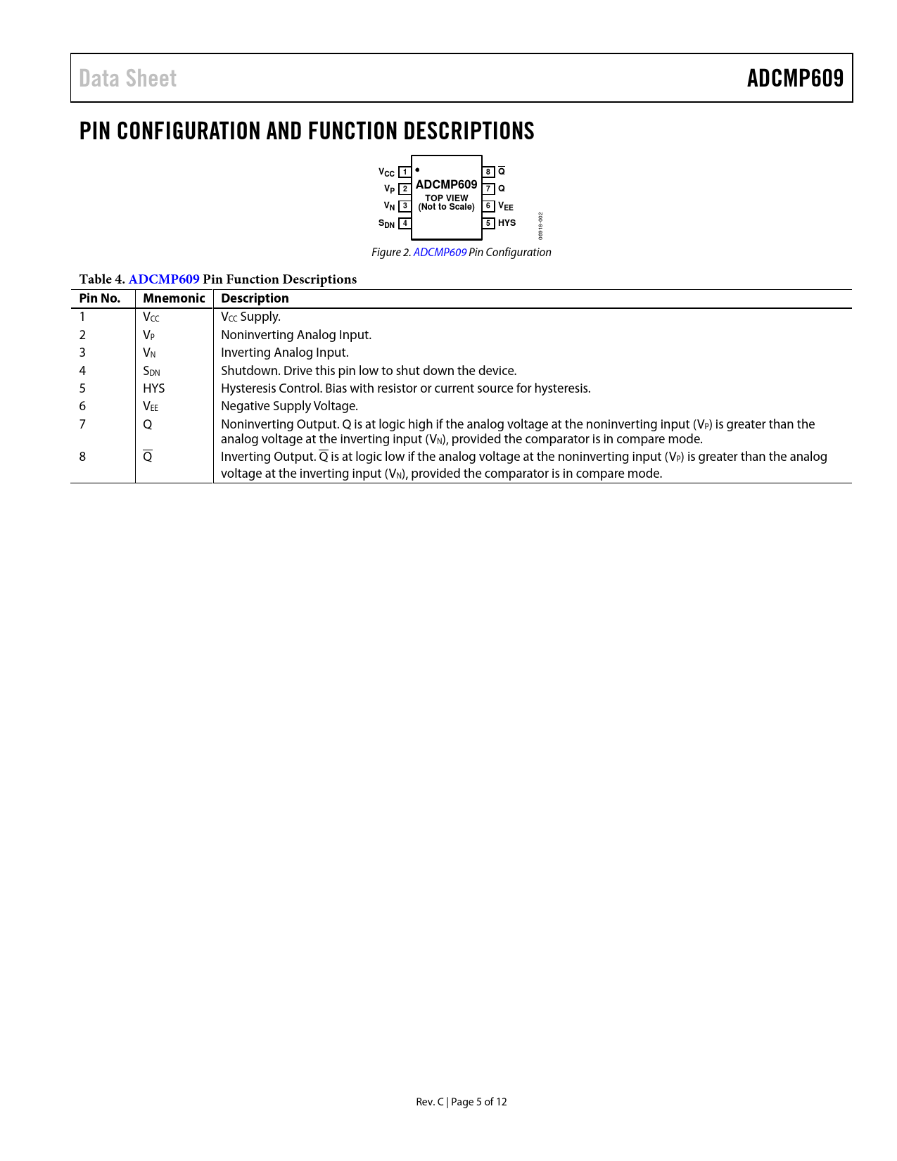 Data Sheet ADCMP609 PIN CONFIGURATION AND FUNCTION DESCRIPTIONS VCC 1 8 Q ADCMP609 VP 2 7 Q TOP VIEW VN 3 (Not to Scale) 6 VEE S