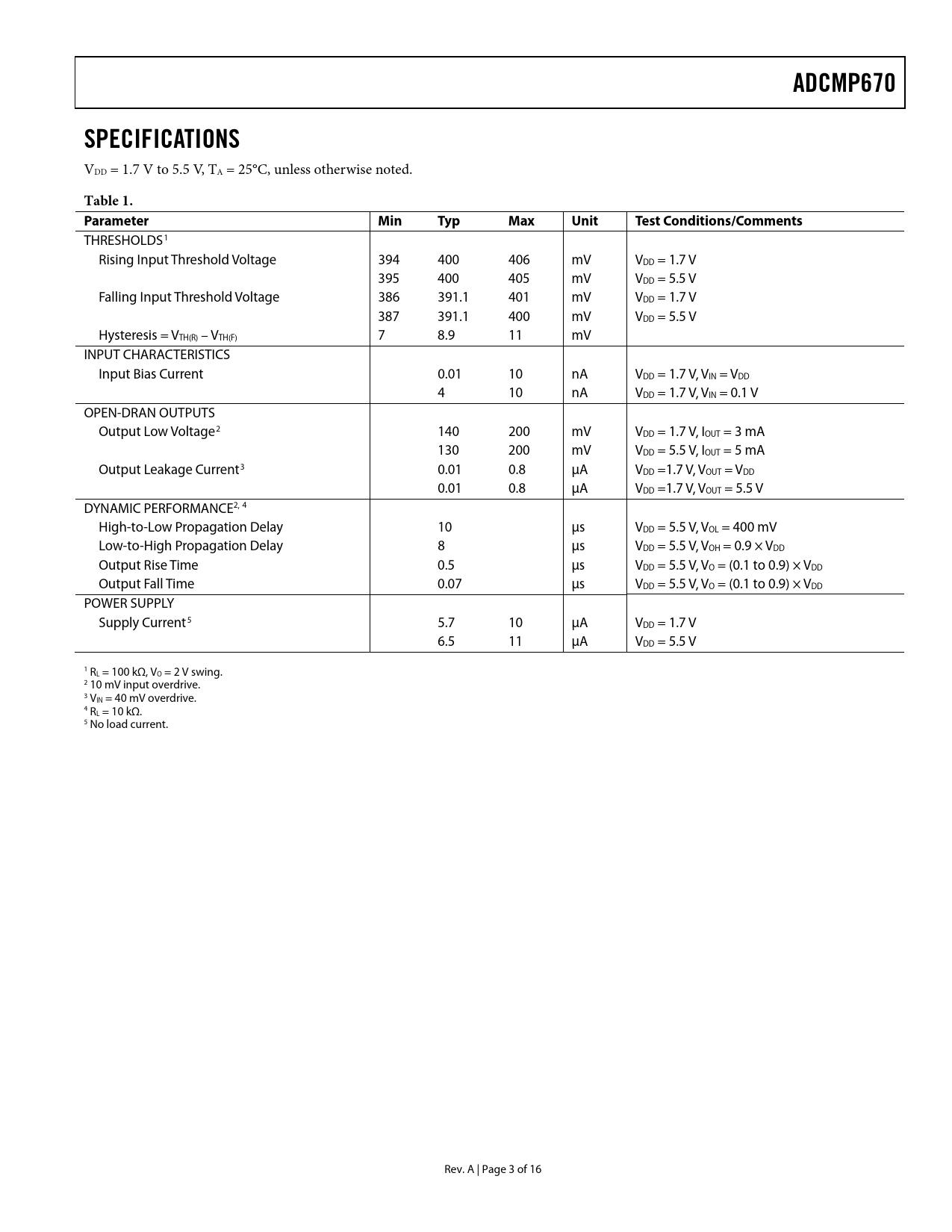 ADCMP670. SPECIFICATIONS. Table 1. Parameter Min. Typ. Max. Unit. Test. Conditions/Comments