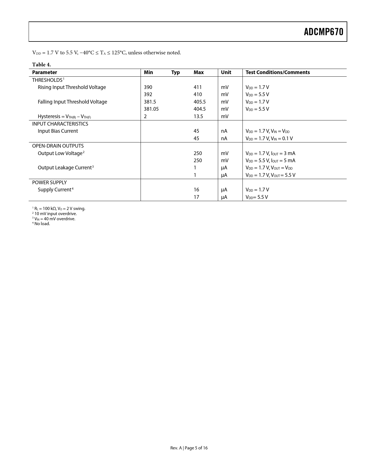 ADCMP670. Table 4. Parameter Min. Typ. Max. Unit. Test. Conditions/Comments