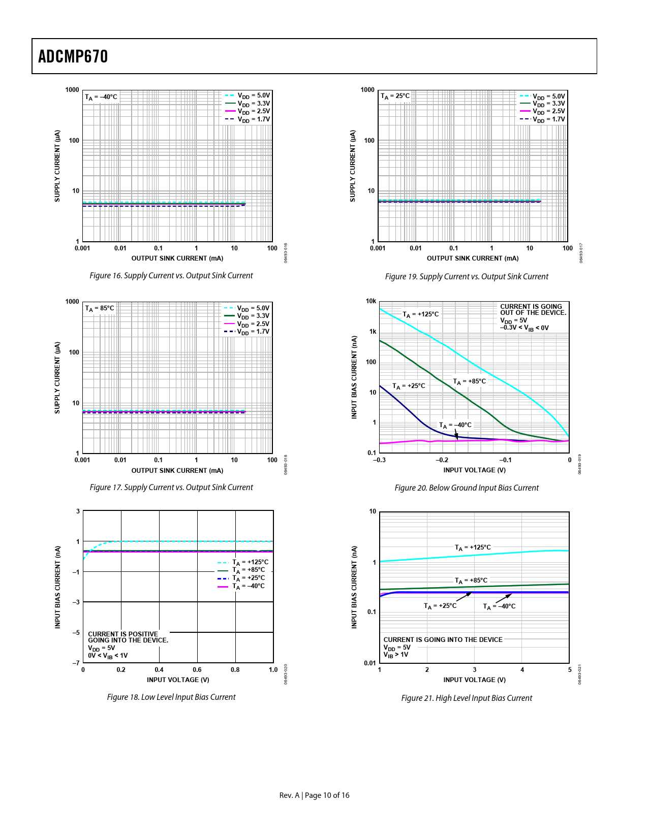 ADCMP670 1000 1000 TA = –40°C VDD = 5.0V TA = 25°C VDD = 5.0V VDD = 3.3V VDD = 3.3V VDD = 2.5V VDD = 2.5V VDD = 1.7V VDD = 1.7V A) A) µ µ ( 100 ( 100 NT NT CURRE CURRE Y Y L L P P 10 10 UP UP S S 1 1 0.001 0.01 0.1 1 10 100