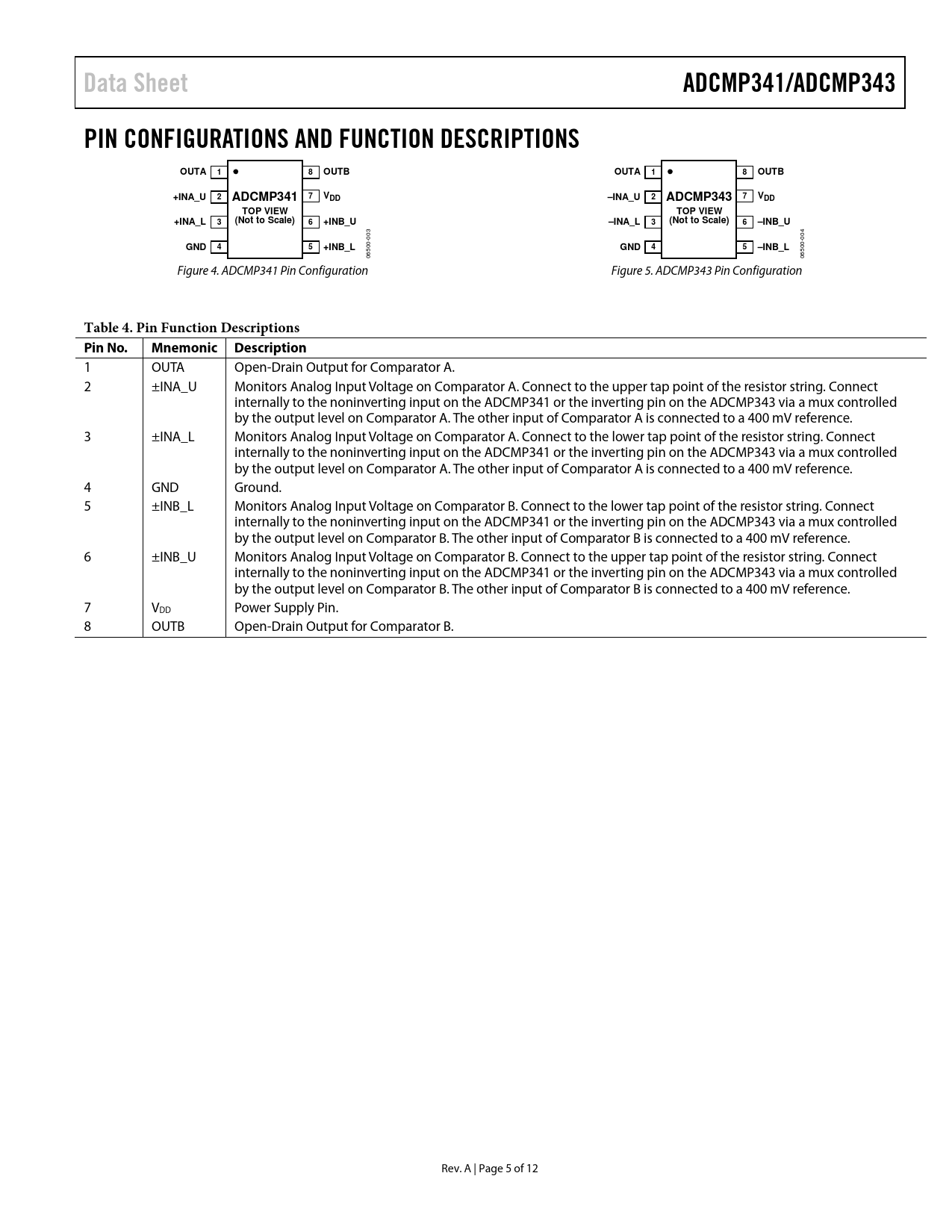 Data SheetADCMP341/ADCMP343PIN CONFIGURATIONS AND FUNCTION DESCRIPTIONSOUTA18OUTBOUTA18OUTB+INA_U27VADCMP341DD–INA_U27VADCMP343DDTOP VIEWTOP VIEW+INA_L3(Not to Scale)6+INB_U–INA_L3(Not to Scale)6–INB_U 003 004 GND45+INB_LGND45–INB_L 06500- 06500- Figure 4. ADCMP341 Pin Configuration Figure 5. ADCMP343 Pin Configuration Table 4. Pin Function Descriptions Pin No.Mnemonic Description 1 OUTA Open-Drain Output for Comparator A. 2 ±INA_U Monitors Analog Input Voltage on Comparator A. Connect to the upper tap point of the resistor string. Connect internally to the noninverting input on the ADCMP341 or the inverting pin on the ADCMP343 via a mux controlled by the output level on Comparator A. The other input of Comparator A is connected to a 400 mV reference. 3 ±INA_L Monitors Analog Input Voltage on Comparator A. Connect to the lower tap point of the resistor string. Connect internally to the noninverting input on the ADCMP341 or the inverting pin on the ADCMP343 via a mux controlled by the output level on Comparator A. The other input of Comparator A is connected to a 400 mV reference. 4 GND Ground. 5 ±INB_L Monitors Analog Input Voltage on Comparator B. Connect to the lower tap point of the resistor string. Connect internally to the noninverting input on the ADCMP341 or the inverting pin on the ADCMP343 via a mux controlled by the output level on Comparator B. The other input of Comparator B is connected to a 400 mV reference. 6 ±INB_U Monitors Analog Input Voltage on Comparator B. Connect to the upper tap point of the resistor string. Connect internally to the noninverting input on the ADCMP341 or the inverting pin on the ADCMP343 via a mux controlled by the output level on Comparator B. The other input of Comparator B is connected to a 400 mV reference. 7 VDD Power Supply Pin. 8 OUTB Open-Drain Output for Comparator B. Rev. A | Page 5 of 12 Document Outline Features Applications General Description Functional Block Diagrams Revision History Specifications Absolute Maximum Ratings Thermal Characteristics ESD Caution Pin Configurations and Function Descriptions Typical Performance Characteristics Application Information Comparators and Internal Reference Power Supply Inputs Outputs Programming Hysteresis Layout Recommendations Outline Dimensions Ordering Guide
