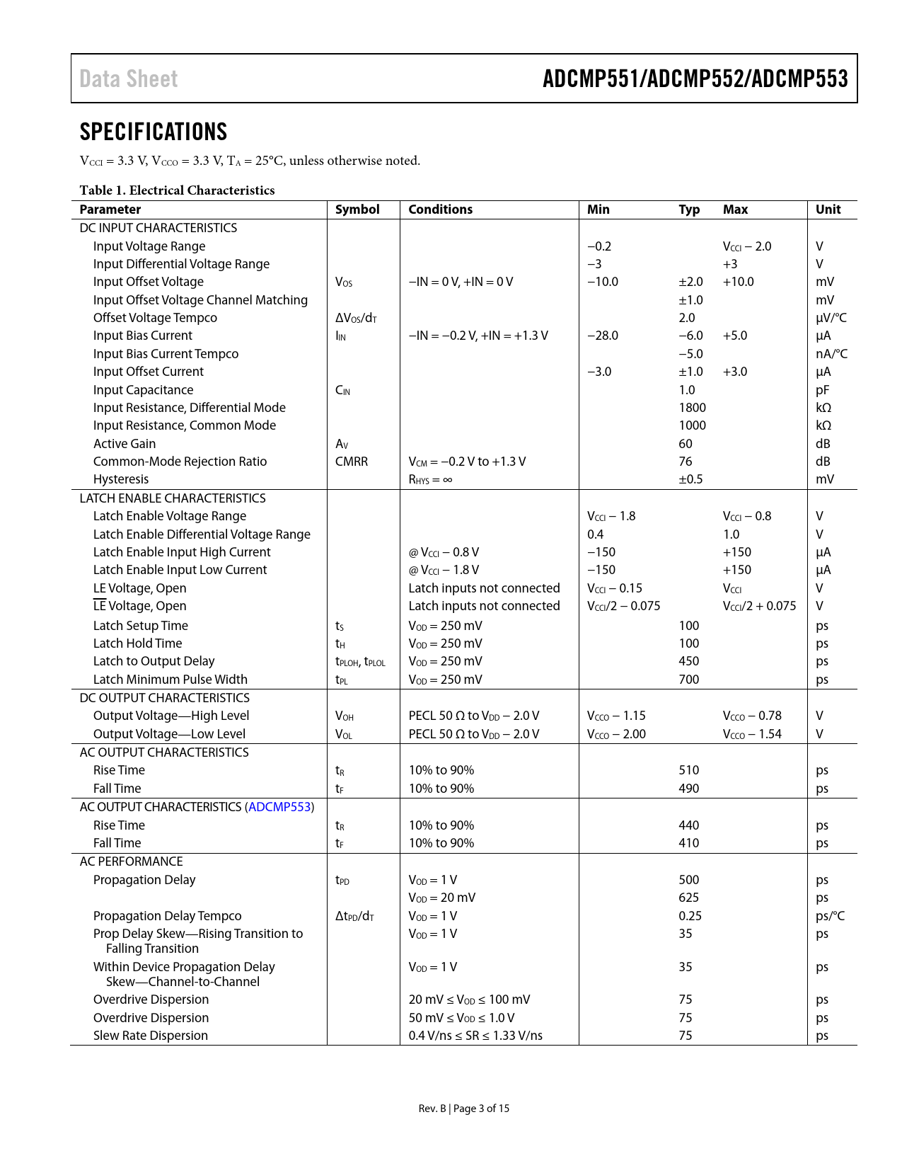 Data Sheet. ADCMP551/ADCMP552/ADCMP553. SPECIFICATIONS. Table 1. Electrical Characteristics Parameter Symbol. Conditions. Min. Typ