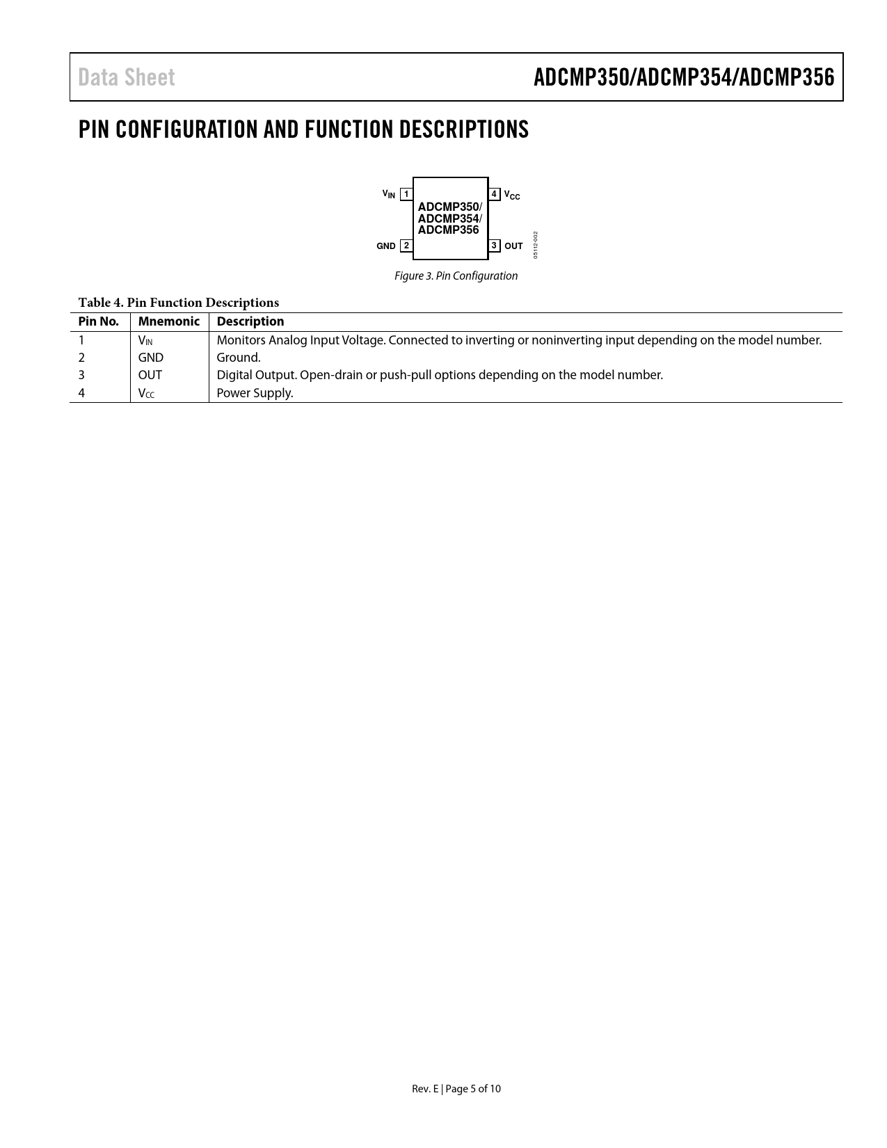Data Sheet ADCMP350/ADCMP354/ADCMP356 PIN CONFIGURATION AND FUNCTION DESCRIPTIONS VCC ADCMP350/ ADCMP354/ ADCMP356 GND OUT
