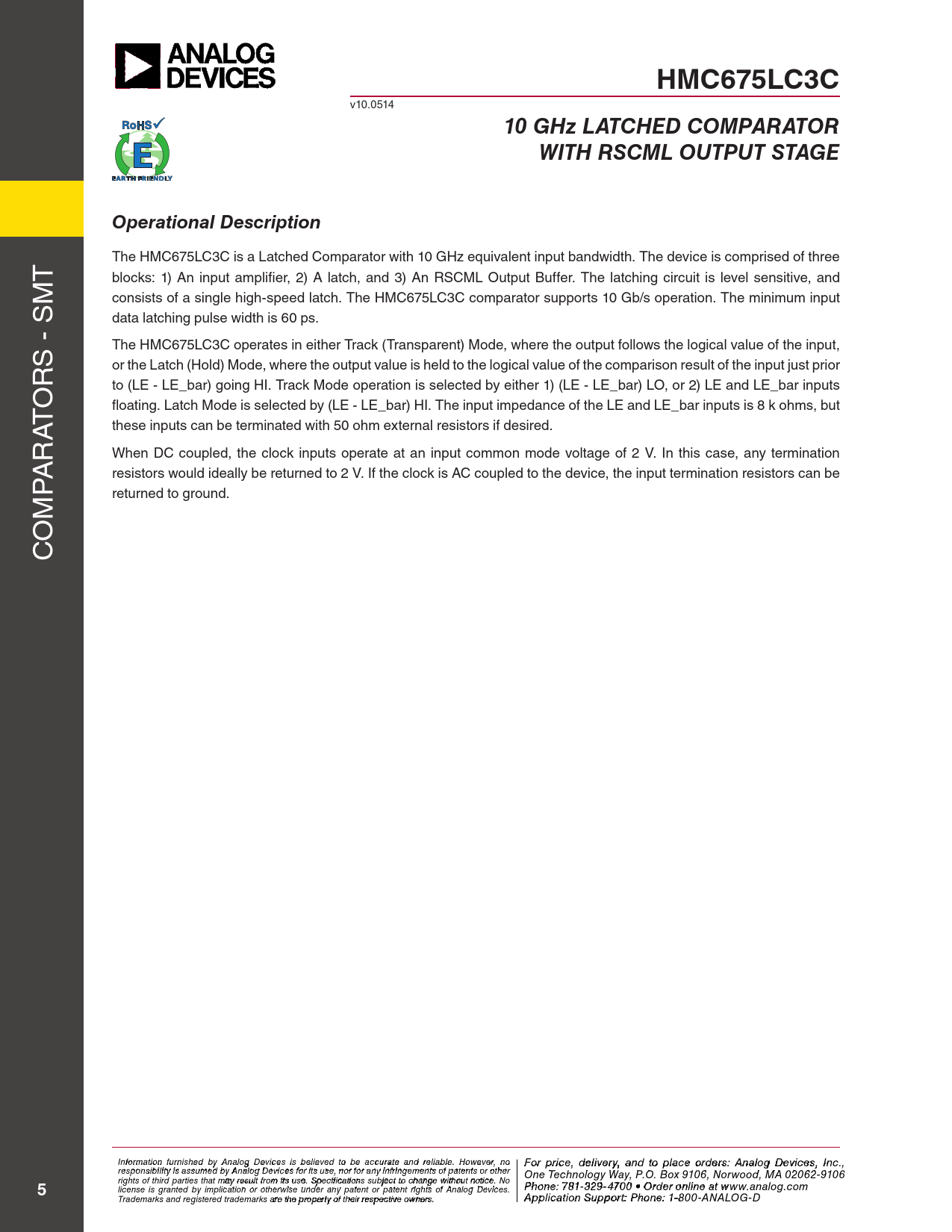 HMC675LC3C v10.0514 10 GHz LATCHED COMPARATORWITH RSCML OUTPUT STAGEOperational Description T The HMC675LC3C is a Latched Comparator with 10 GHz equivalent input bandwidth. The device is comprised of three blocks: 1) An input amplifier, 2) A latch, and 3) An RSCML Output Buffer. The latching circuit is level sensitive, and M consists of a single high-speed latch. The HMC675LC3C comparator supports 10 Gb/s operation. The minimum input data latching pulse width is 60 ps. S - S The HMC675LC3C operates in either Track (Transparent) Mode, where the output fol ows the logical value of the input, R or the Latch (Hold) Mode, where the output value is held to the logical value of the comparison result of the input just prior O to (LE - LE_bar) going HI. Track Mode operation is selected by either 1) (LE - LE_bar) LO, or 2) LE and LE_bar inputs floating. Latch Mode is selected by (LE - LE_bar) HI. The input impedance of the LE and LE_bar inputs is 8 k ohms, but AT these inputs can be terminated with 50 ohm external resistors if desired. R When DC coupled, the clock inputs operate at an input common mode voltage of 2 V. In this case, any termination A P resistors would ideal y be returned to 2 V. If the clock is AC coupled to the device, the input termination resistors can be returned to ground. OM C I F nf o or r p mati r o in cfe ur , d nish e e l d iv b e y r A y a nalo n g d t Devi o p ces i la s c bele o ieve rd d t e o rbs e : H acc iutrtatite e M and ic reli rao bl w e. a H v o e C wever o , nrp o For price, delivery, and to place orders: Analog Devices, Inc., responsibility is assumed by Analog Devices for its use, nor for any infringements of patents or other oration, 2 Elizabeth Drive, Chelmsford, MA 01824 One Technology Way, P.O. Box 9106, Norwood, MA 02062-9106 Phone: 978-250-3343 Fax: 978-250-3373 O rights of third parties that may result from its use. Specifications subject to change without notice. No rd Phoe n r O e: 7 n- 81-li 3 n 2 e a 9-4 t w 70 ww 0 • O . rdh e itt r o it nle i . n co e a m 5 license is granted by implication or otherwise under any patent or patent rights of Analog Devices. t www.analog.com Application Support: Phon Trademarks and registered trademarks are the property of their respective owners. e: 978-250-334 A 3 o pplic r a atio pp n S s u @ p h por ittti : Pte ho.c n o e m : 1-800-ANALOG-D