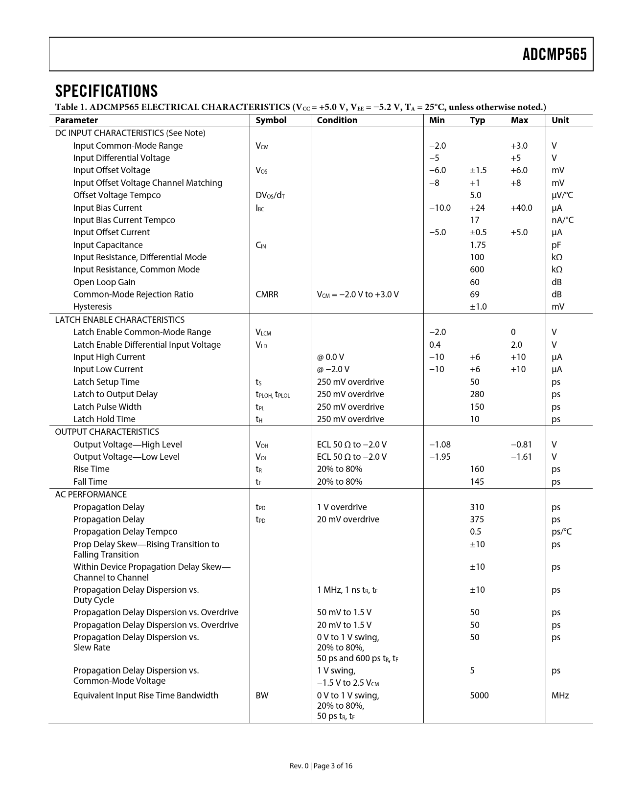 ADCMP565 SPECIFICATIONS