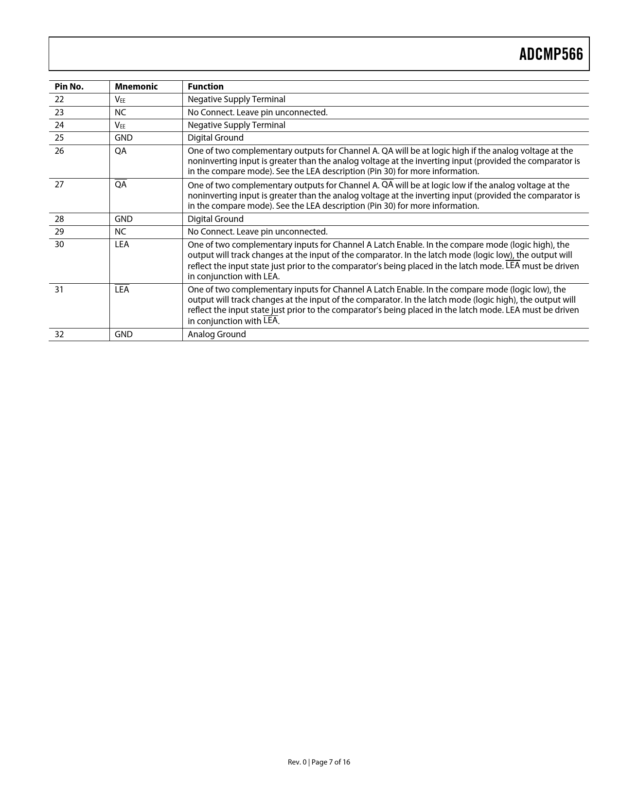 22 VEE Negative Supply Terminal 23 NC No Connect. Leave pin unconnected. 24 VEE Negative Supply Terminal 25 GND Digital Ground 26 QA One of two complementary outputs for Channel A. QA will be at logic high if the analog voltage at the noninverting input is greater than the analog voltage at the inverting input (provided the comparator is in the compare mode). See the LEA description (Pin 30) for more information. 27 QA One of two complementary outputs for Channel A. QA will be at logic low if the analog voltage at the noninverting input is greater than the analog voltage at the inverting input (provided the comparator is in the compare mode). See the LEA description (Pin 30) for more information. 28 GND Digital Ground 29 NC No Connect. Leave pin unconnected. 30 LEA One of two complementary inputs for Channel A Latch Enable. In the compare mode (logic high), the output will track changes at the input of the comparator. In the latch mode (logic low), the output will reflect the input state just prior to the comparator’s being placed in the latch mode. LEA must be driven in conjunction with LEA. 31 LEA One of two complementary inputs for Channel A Latch Enable. In the compare mode (logic low), the output will track changes at the input of the comparator. In the latch mode (logic high), the output will reflect the input state just prior to the comparator’s being placed in the latch mode. LEA must be driven in conjunction with LEA. 32 GND Analog Ground Rev. 0 | Page 7 of 16 Document Outline SPECIFICATIONS ABSOLUTE MAXIMUM RATINGS THERMAL CONSIDERATIONS ESD CAUTION PIN CONFIGURATION AND FUNCTION DESCRIPTIONS TIMING INFORMATION APPLICATION INFORMATION CLOCK TIMING RECOVERY OPTIMIZING HIGH SPEED PERFORMANCE COMPARATOR PROPAGATION DELAY DISPERSION COMPARATOR HYSTERESIS MINIMUM INPUT SLEW RATE REQUIREMENT TYPICAL APPLICATION CIRCUITS TYPICAL PERFORMANCE CHARACTERISTICS OUTLINE DIMENSIONS ORDERING GUIDE