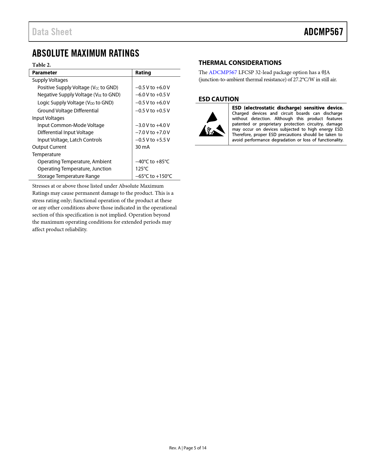 Data Sheet ADCMP567 ABSOLUTE MAXIMUM RATINGS Table 2 THERMAL CONSIDERATIONS Parameter Rating ESD CAUTION