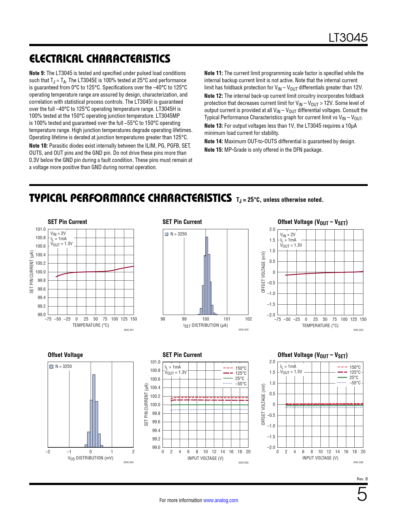 LT3045 ELECTRICAL CHARACTERISTICS Note 9: The LT3045 is tested and specified under pulsed load conditions Note 11: The current limit programming scale factor is specified while the such that TJ ≈ TA. The LT3045E is 100% tested at 25°C and performance internal backup current limit is not active. Note that the internal current is guaranteed from 0°C to 125°C. Specifications over the –40°C to 125°C limit has foldback protection for VIN – VOUT differentials greater than 12V. operating temperature range are assured by design, characterization, and Note 12: The internal back-up current limit circuitry incorporates foldback correlation with statistical process controls. The LT3045I is guaranteed protection that decreases current limit for VIN – VOUT > 12V. Some level of over the full –40°C to 125°C operating temperature range. LT3045H is output current is provided at all VIN – VOUT differential voltages. Consult the 100% tested at the 150°C operating junction temperature. LT3045MP Typical Performance Characteristics graph for current limit vs VIN – VOUT. is 100% tested and guaranteed over the full −55°C to 150°C operating Note 13: For output voltages less than 1V, the LT3045 requires a 10µA temperature range. High junction temperatures degrade operating lifetimes. minimum load current for stability. Operating lifetime is derated at junction temperatures greater than 125°C. Note 14: Maximum OUT-to-OUTS differential is guaranteed by design. Note 10: Parasitic diodes exist internally between the ILIM, PG, PGFB, SET, OUTS, and OUT pins and the GND pin. Do not drive these pins more than Note 15: MP-Grade is only offered in the DFN package. 0.3V below the GND pin during a fault condition. These pins must remain at a voltage more positive than GND during normal operation. TYPICAL PERFORMANCE CHARACTERISTICS TJ = 25°C, unless otherwise noted.SET Pin CurrentSET Pin CurrentOffset Voltage (VOUT – VSET) 101.0 2.0 VIN = 2V N = 3250 V 100.8 I IN = 2V L = 1mA 1.5 I V L = 1mA OUT = 1.3V 100.6 VOUT = 1.3V 1.0 100.4 100.2 0.5 100.0 TAGE (mV) 0 99.8 –0.5 99.6 SET PIN CURRENT (µA) OFFSET VOL –1.0 99.4 99.2 –1.5 99.0 –2.0 –75 –50 –25 0 25 50 75 100 125 150 98 99 100 101 102 –75 –50 –25 0 25 50 75 100 125 150 TEMPERATURE (°C) ISET DISTRIBUTION (µA) TEMPERATURE (°C) 3045 G01 3045 G02 3045 G03 Offset VoltageSET Pin CurrentOffset Voltage (VOUT – VSET) 101.0 2.0 N = 3250 IL = 1mA 150°C I 150°C 100.8 L = 1mA VOUT = 1.3V 125°C 1.5 VOUT = 1.3V 125°C 100.6 25°C 25°C –55°C 1.0 –55°C 100.4 100.2 0.5 TAGE (mV) 100.0 0 99.8 –0.5 99.6 SET PIN CURRENT (µA) OFFSET VOL –1.0 99.4 99.2 –1.5 99.0 –2.0 –2 –1 0 1 2 0 2 4 6 8 10 12 14 16 18 20 0 2 4 6 8 10 12 14 16 18 20 VOS DISTRIBUTION (mV) INPUT VOLTAGE (V) INPUT VOLTAGE (V) 3045 G04 3045 G05 3045 G06 Rev. B For more information www.analog.com 5 Document Outline Features Applications Typical Application Description Absolute Maximum Ratings Pin Configuration Order Information Electrical Characteristics Typical Performance Characteristics Pin Functions Block Diagram Applications Information Typical Applications Package Description Revision History Typical Application Related Parts