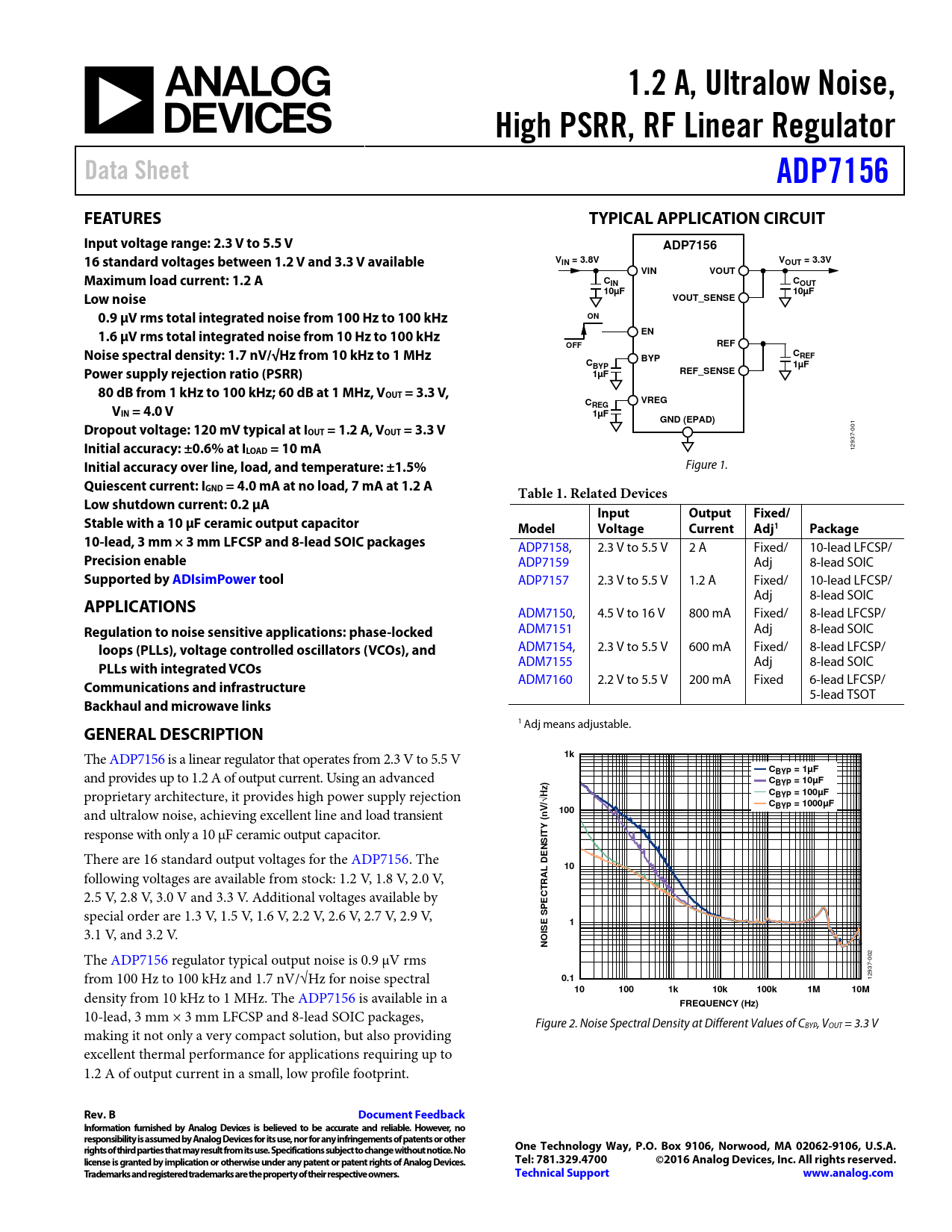 10-lead, 3 mm × 3 mm LFCSP and 8-lead SOIC packages, Figure 2. Noise Spectral Density at Different Values of CBYP, VOUT = 3.3 V making it not only a very compact solution, but also providing excel ent thermal performance for applications requiring up to 1.2 A of output current in a small, low profile footprint.