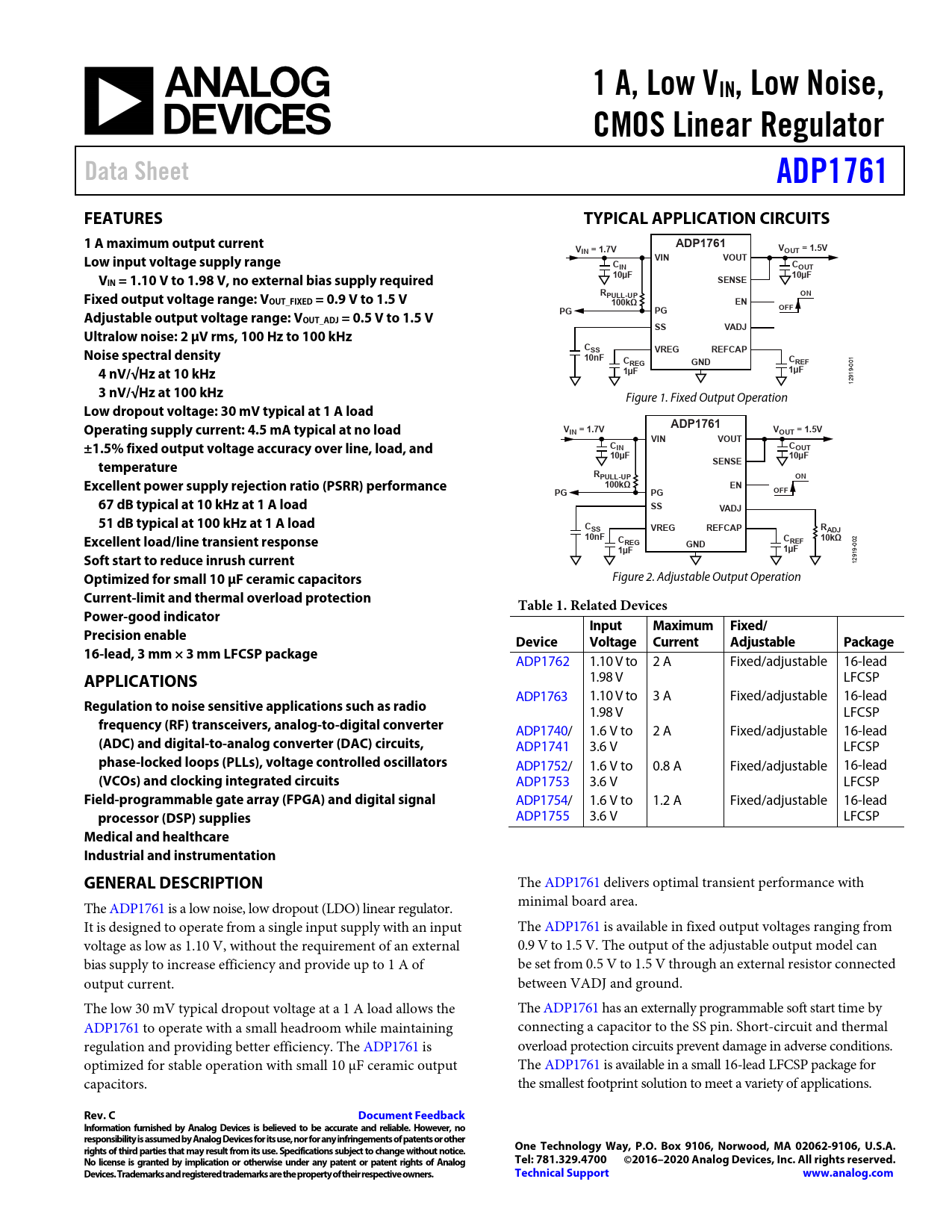 1 A, Low VIN, Low Noise,. CMOS Linear Regulator. Data Sheet. ADP1761. FEATURES. TYPICAL APPLICATION CIRCUITS