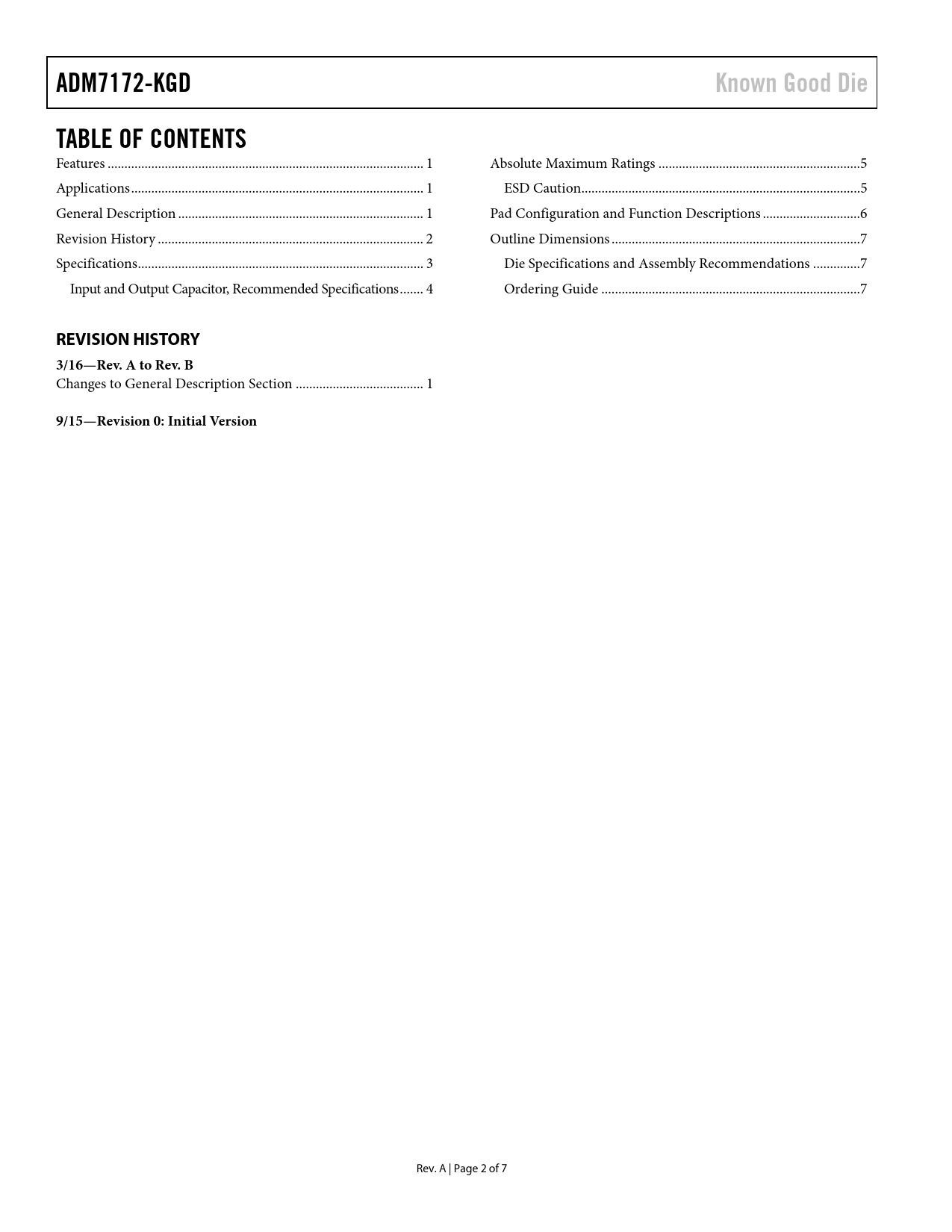 Seiten / Seite7 / 2 — ADM7172-KGD. Known Good Die. TABLE OF CONTENTS. REVISION HISTORY …